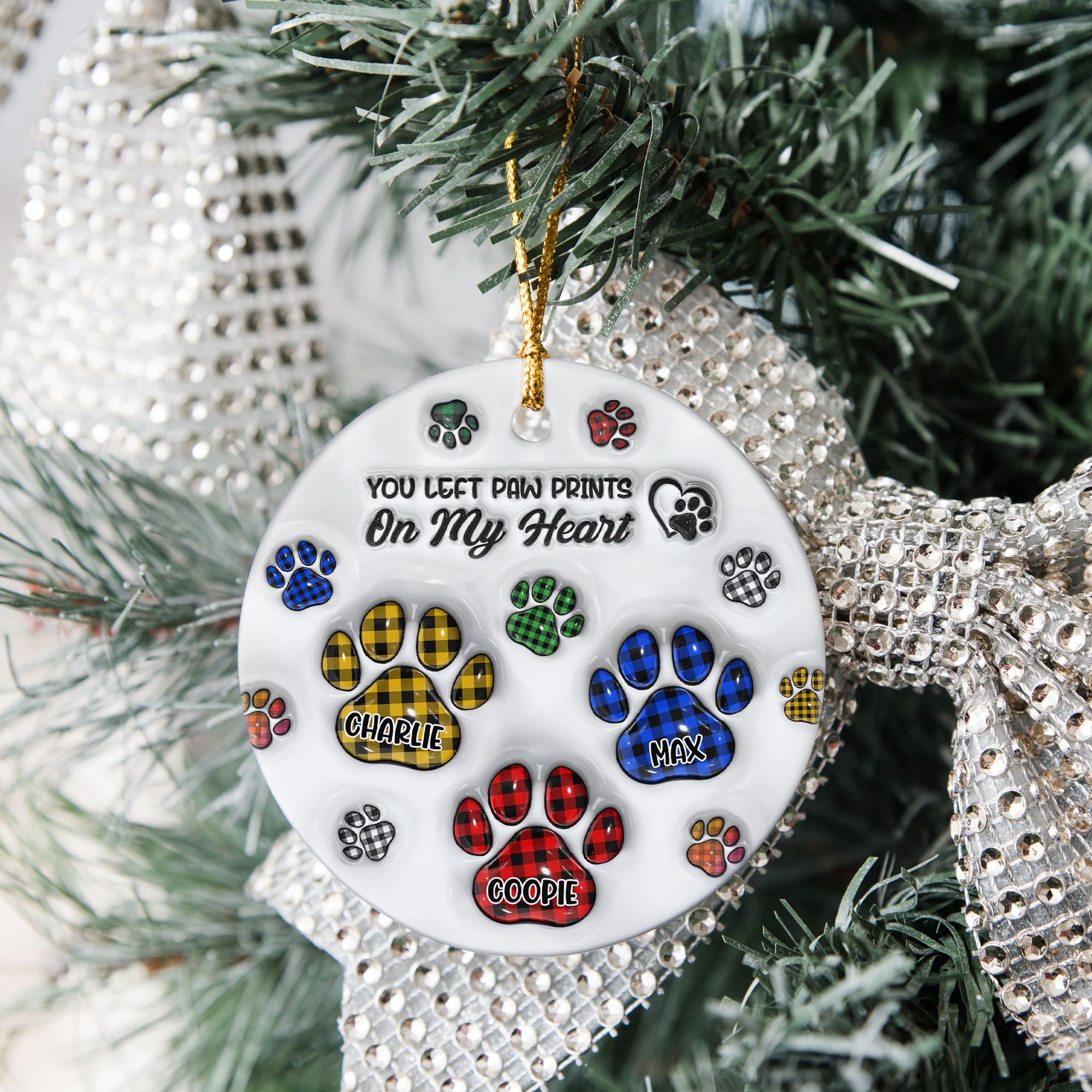 Honor the cherished memory of your beloved pet with this Custom Photo "You Left Paw Prints On My Heart" Memorial Ornament. Featuring a captivating 3D inflated effect printed on durable ceramic, this ornament brings your pet’s photo to life with depth and clarity. Its heartfelt design serves as a touching keepsake, perfect for remembering the unique bond you shared. Display it proudly to keep your furry friend close to your heart every day.
