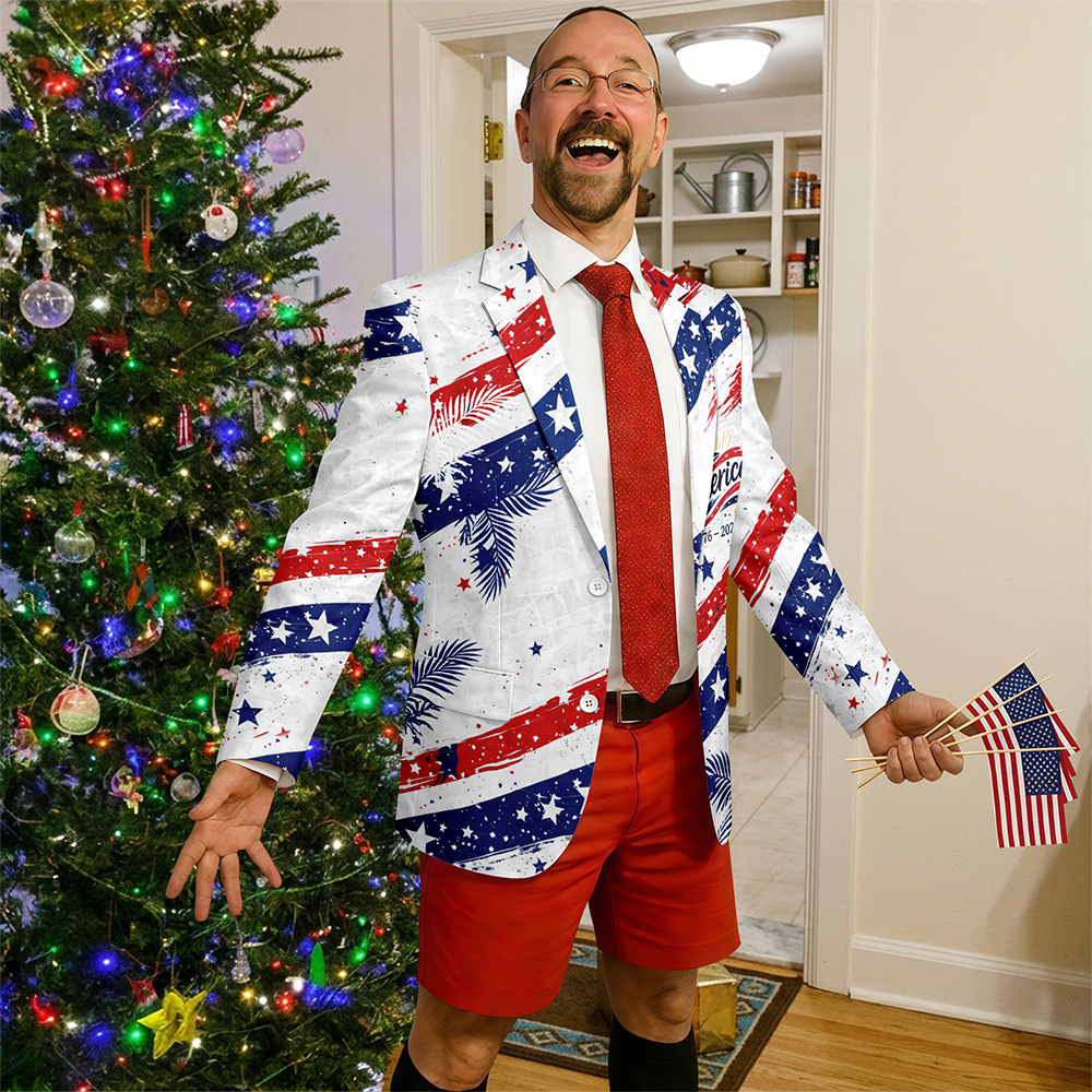 Make a bold statement with this America 250 years semiquincentennial 1776–2026 men’s suit. Featuring a striking patriotic design, it’s perfect for celebrating this historic milestone in standout style. Ideal for themed parties, national events, or special occasions, this suit lets you show your pride while turning heads.