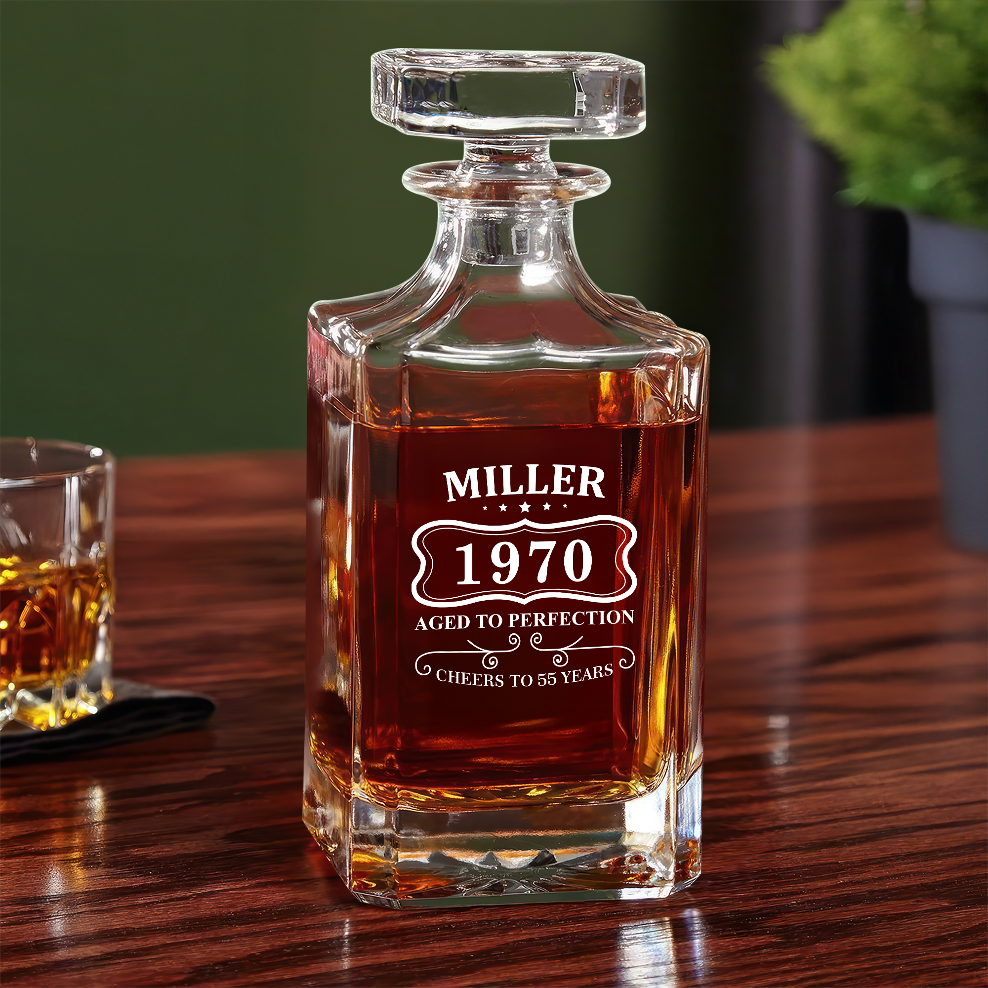Celebrate milestones in style with this personalized aged to perfection birthday decanter. Customized with a name or special message, it transforms into a treasured keepsake that honors the guest of honor. Perfect for whiskey, bourbon, or fine spirits, this elegant glass vessel combines functionality with heartfelt sentiment. Whether marking a significant birthday or retirement, this thoughtful gift impresses discerning tastes and becomes a conversation piece for years to come. An ideal choice for those who appreciate quality craftsmanship and personalized touches.