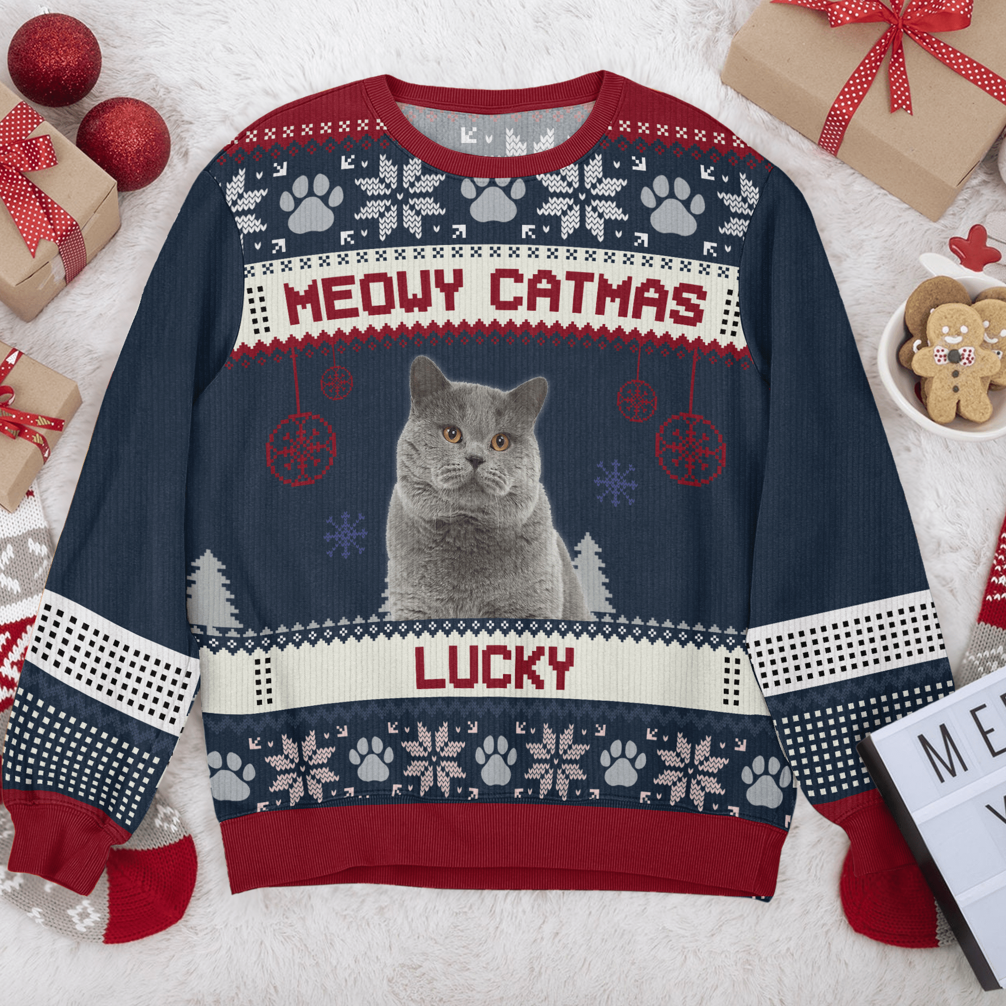 Spread joy and laughter this holiday season with our Custom Photo Meowy Catmas sweater. The all-over-print design showcases funny cartoon cats, making it the purrfect gift for cat lovers. Stay cozy and stylish while showing off your love for felines. Meowy Catmas, everyone!