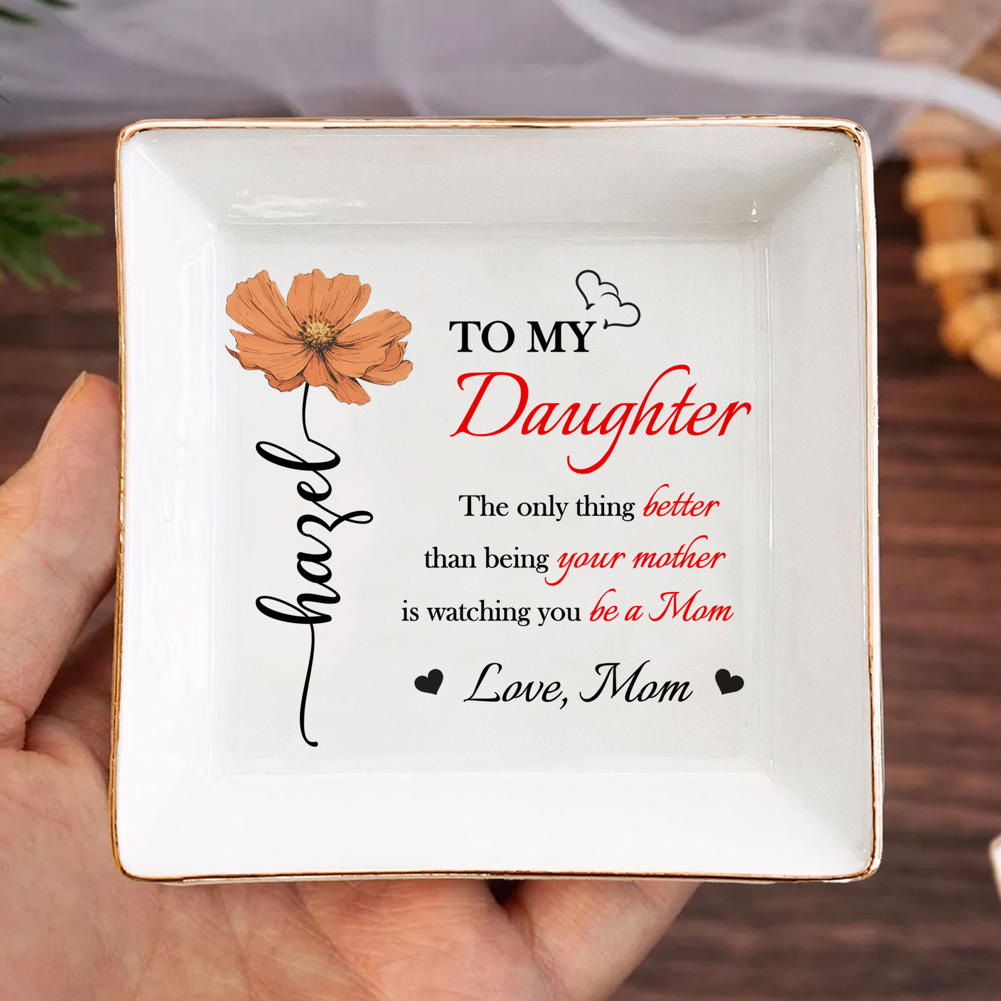Give your daughter a gift that's better than being your mother - a personalized jewelry dish to remind her of your love and support as she navigates motherhood. She'll cherish this thoughtful and practical gift from mom. Perfect for holding rings, earrings, and other small treasures.