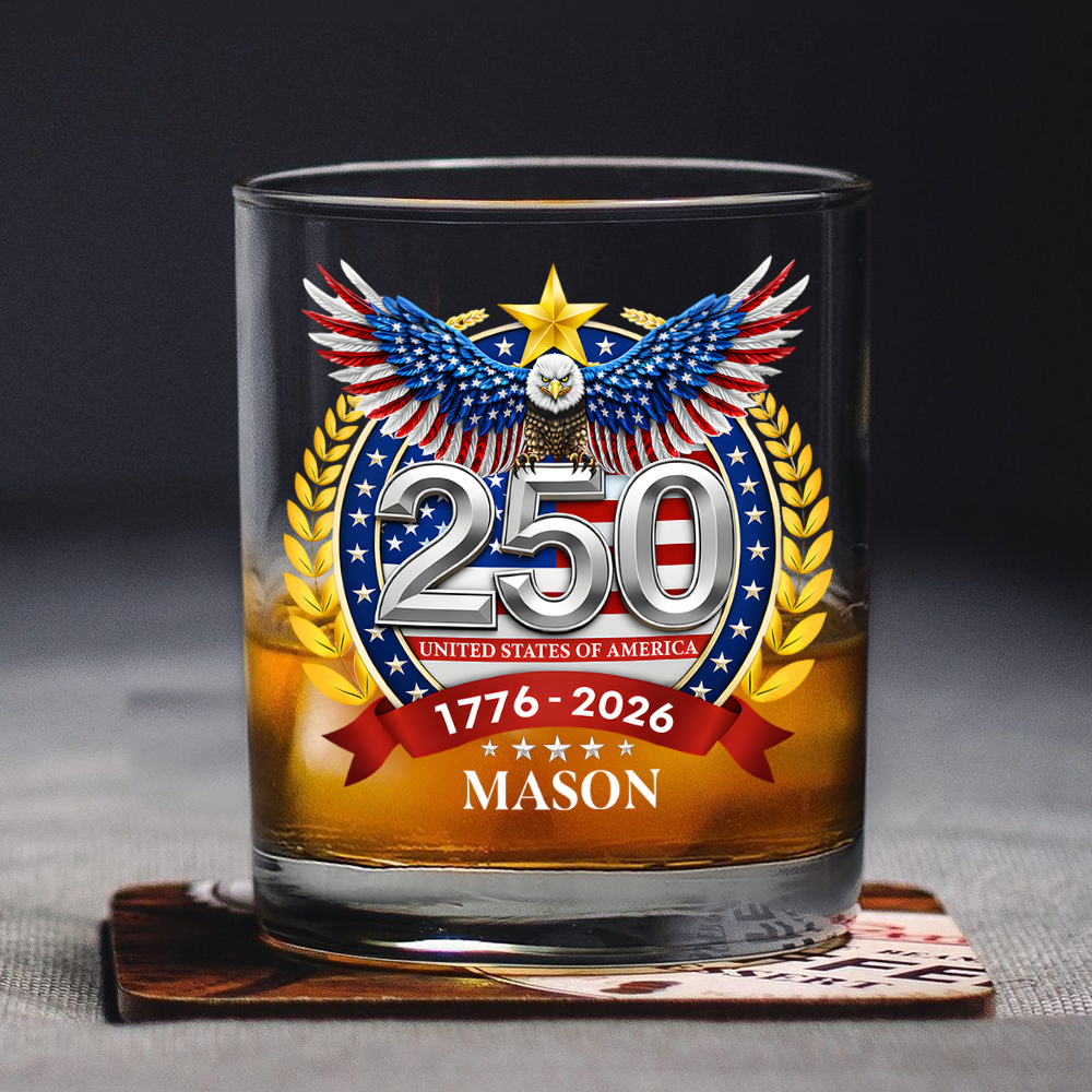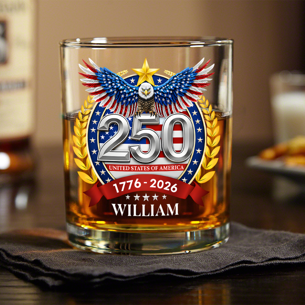 Celebrate America's legacy with this distinguished whiskey glass, custom with your name to commemorate 250 years of independence. Crafted for the discerning spirit enthusiast, this premium glass features elegant USA-themed design elements that honor the nation's rich history. Perfect for toasting milestones, gifting to patriotic collectors, or elevating your home bar with timeless Americana style. Each personalized piece becomes a meaningful keepsake that blends sophistication with patriotic pride, making every sip a tribute to tradition and achievement.