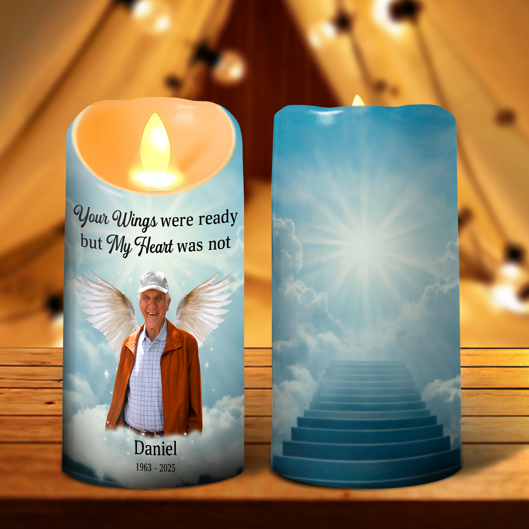 Honor your father's memory with this personalized LED candle, a touching tribute that keeps his spirit alive. The custom photo feature transforms your cherished memories into a glowing memorial that brings comfort during difficult times. This heartfelt sympathy gift creates a warm, flickering ambiance while celebrating the special bond you shared. A meaningful way to remember dad every day.
