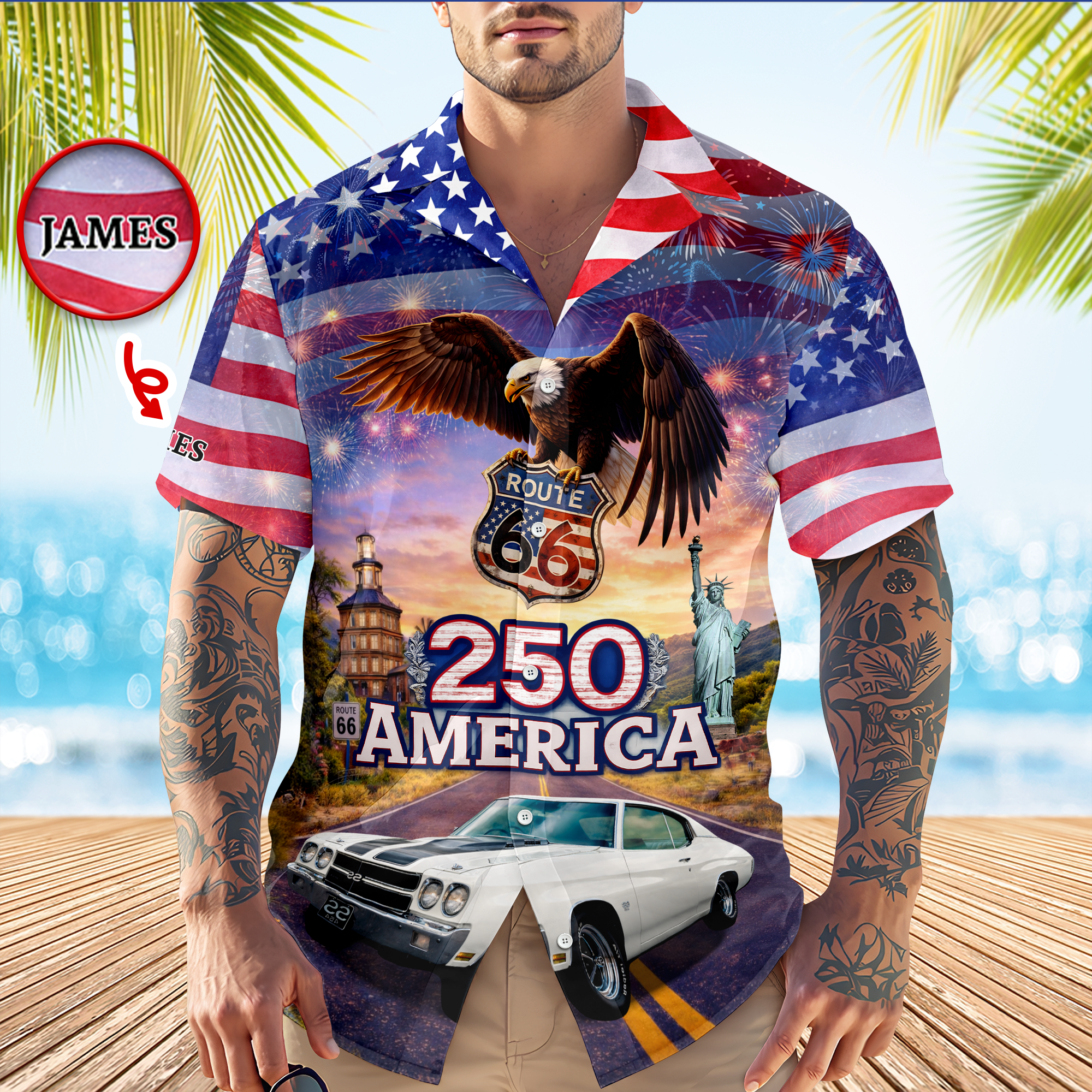 Hit the road in style with this custom photo “Route 66 – 250 Years of America Ride” Hawaiian shirt. Personalized with your chosen photo, it adds a unique and memorable touch to the vintage-inspired design. Perfect for road trips, summer outings, or patriotic events. A fun and comfortable keepsake to celebrate 250 years of American spirit.