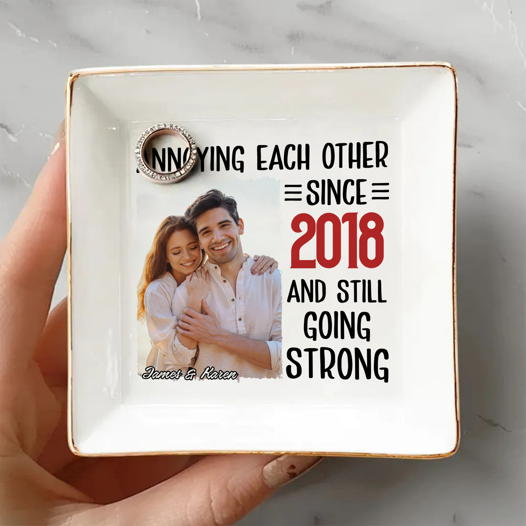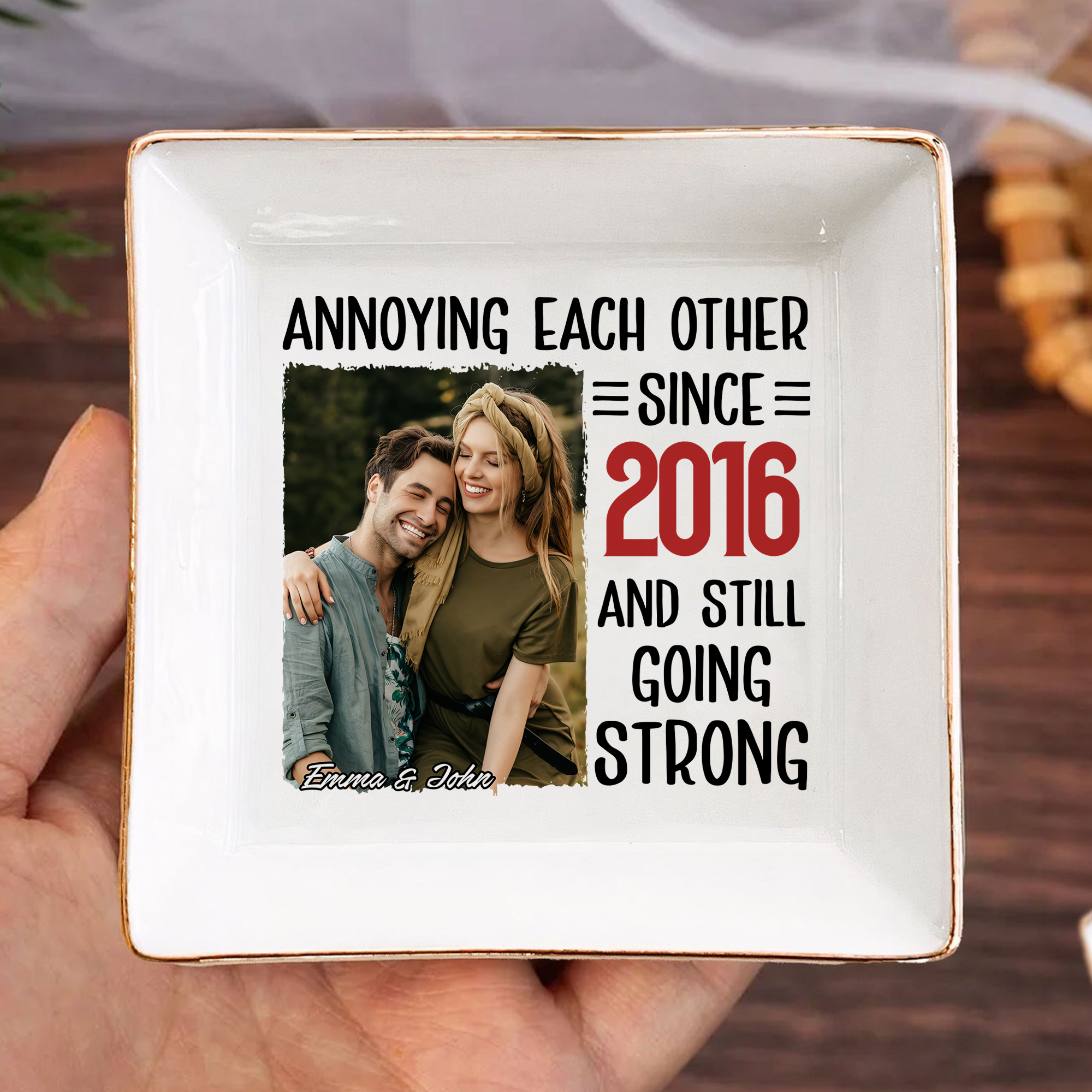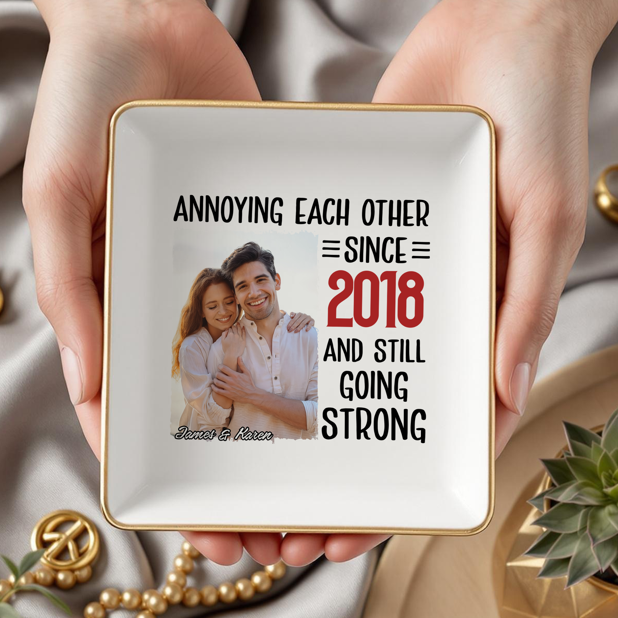 Celebrate your love story with this charming custom photo jewelry dish, the perfect Valentine's gift for couples who appreciate humor and sentiment. Personalize it with your favorite photo to create a one-of-a-kind keepsake that holds more than just jewelry—it holds your memories. The witty "annoying each other" design captures the playful reality of lasting relationships, making it both functional and meaningful. Ideal for displaying rings, earrings, and cherished moments on a nightstand or dresser, this custom piece transforms everyday storage into a heartfelt reminder of your bond. Give a gift that's as unique as your relationship.