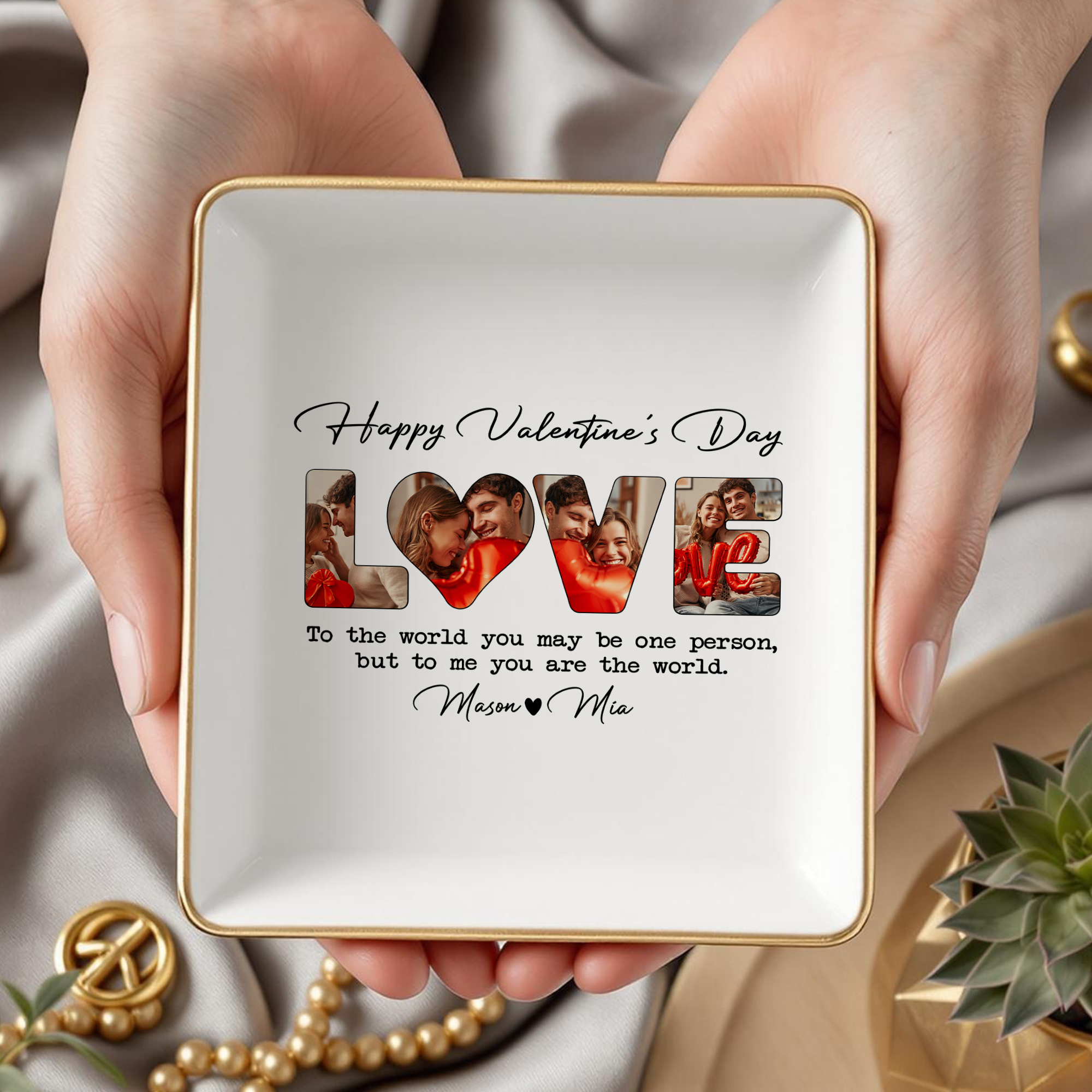 Celebrate your deepest connection with this personalized Valentine jewelry dish, custom-crafted to feature your cherished photo. The heartfelt message "To Me You Are The World" is elegantly displayed, making it a meaningful keepsake for the one you love. Perfect for storing rings, earrings, and delicate treasures, this decorative dish combines functionality with romance. Whether displayed on a nightstand or dresser, it serves as a daily reminder of your bond. An unforgettable gift that transforms a practical piece into a sentimental treasure, capturing the essence of true love in one beautiful creation.