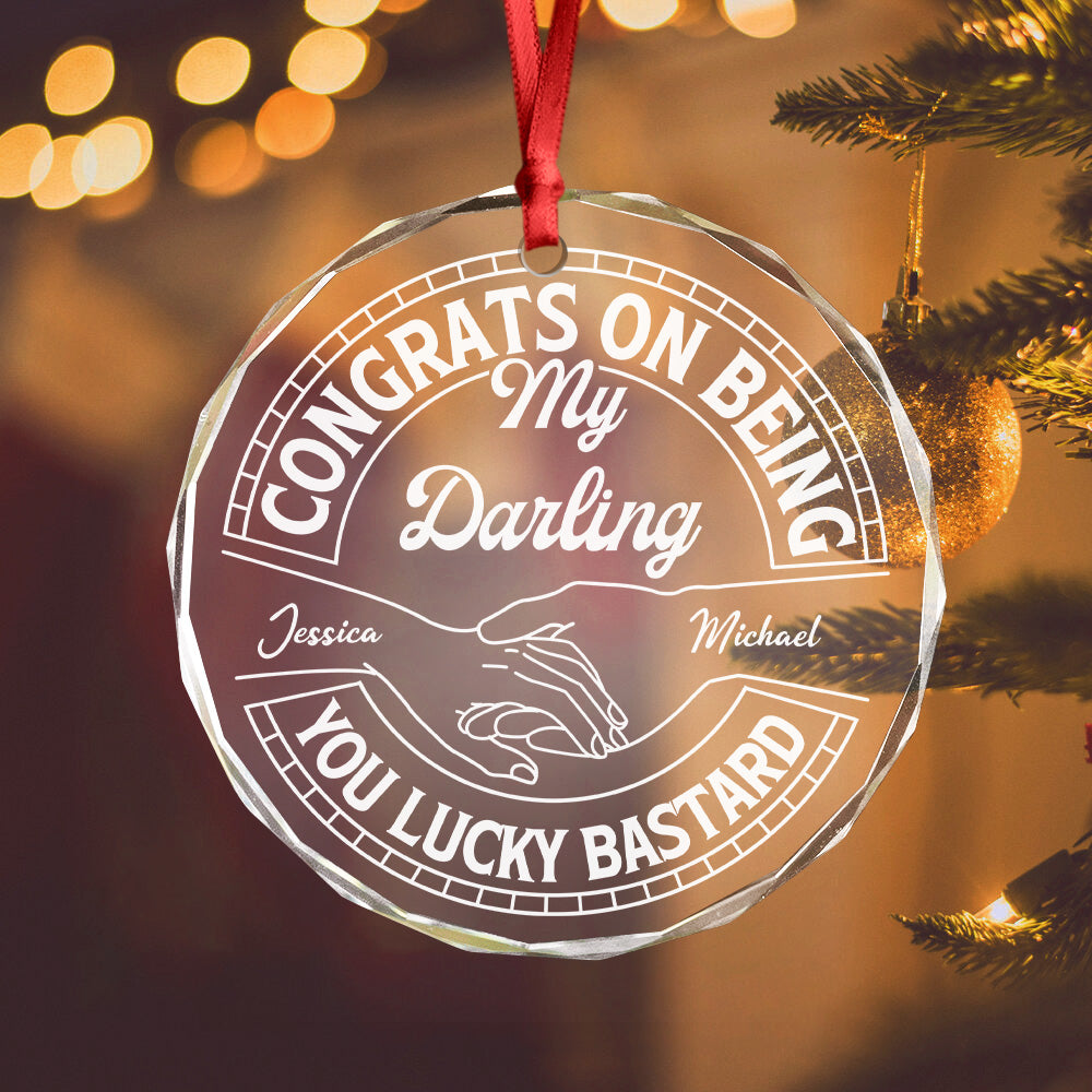 Celebrate your special bond with this elegant glass circle ornament, perfect for any couple. Inscribed with "Congrats On Being My Husband You Lucky Man," it makes a charming keepsake to honor the joy of marriage. Crafted with care, this ornament adds a heartfelt touch to your home or holiday decor, serving as a daily reminder of love and commitment. A thoughtful and memorable gift that speaks volumes without saying a word.