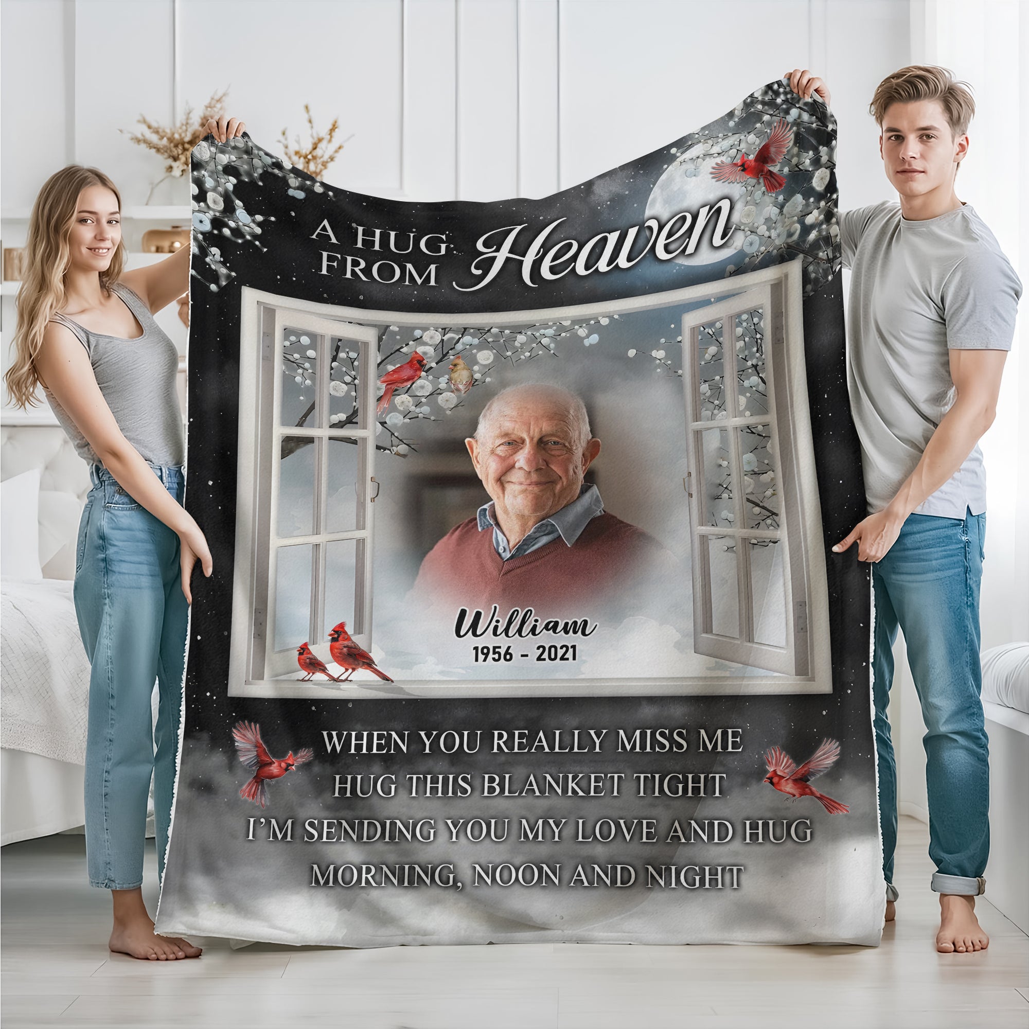 Wrap your loved ones in warmth and cherished memories with the Custom Dad Mom Photo A Hug From Heaven Memorial Blanket. This heartfelt keepsake features personalized photos, creating a comforting tribute that feels like a gentle embrace from above. Perfect for honoring the special bond with mom and dad, it offers both warmth and a lasting reminder of love that never fades.