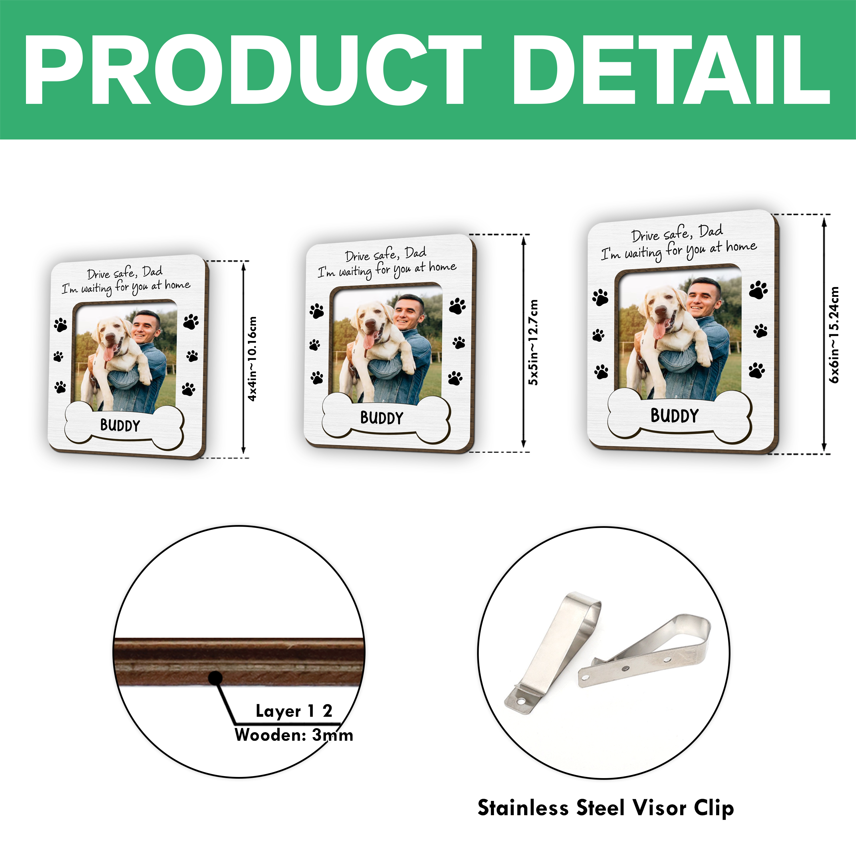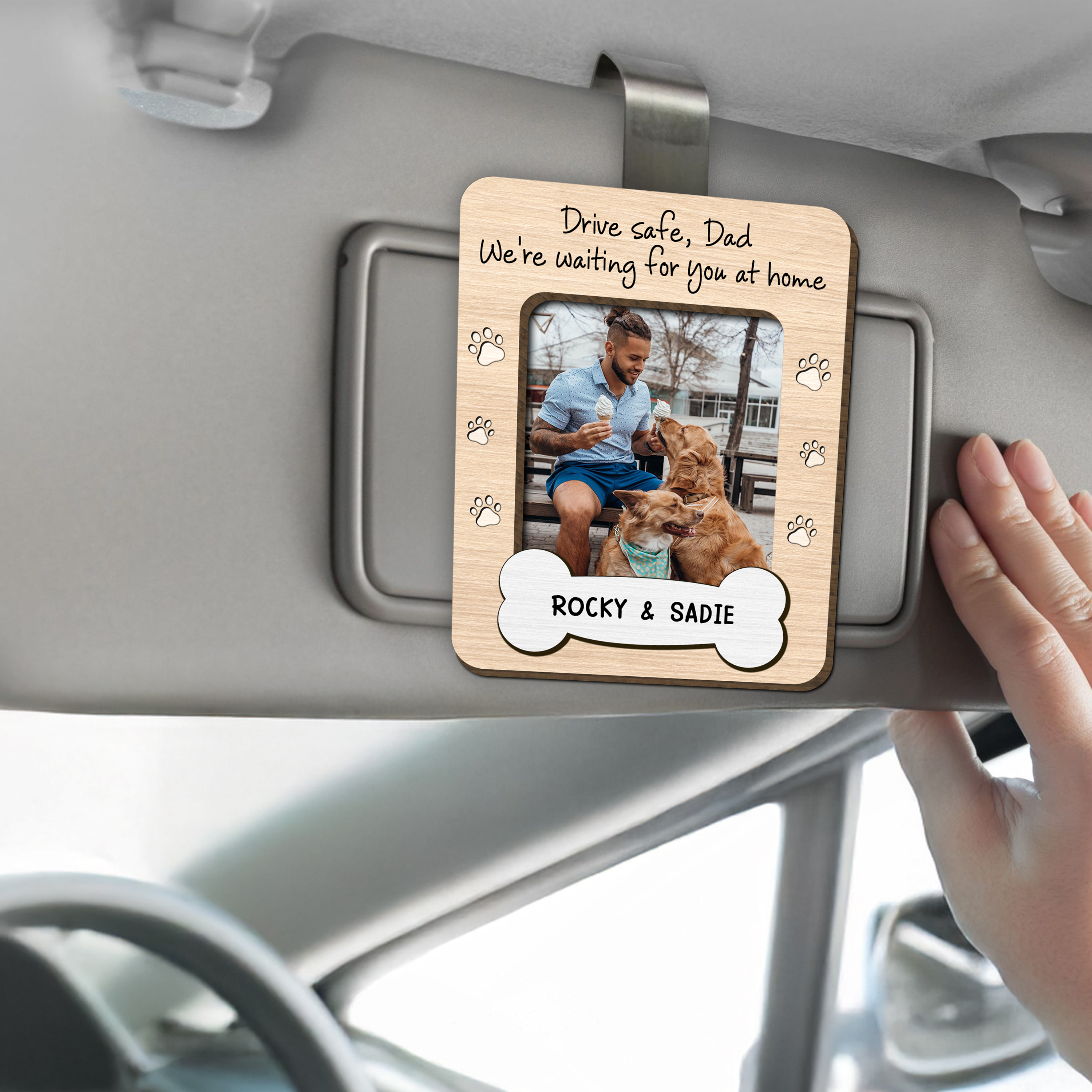 Keep your furry friend close during every journey with our Custom Dog Dad Photo Drive Safe Daddy Car Visor Clip. This 2-layered design securely attaches to your vehicle's visor, displaying your beloved pet's photo while serving as a thoughtful reminder to drive safely. The perfect gift for any dog dad who wants to carry their four-legged family member wherever the road takes them.