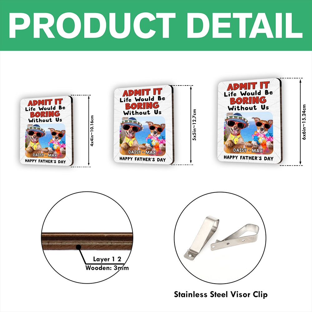 Keep your furry friend and dad close on every journey with this custom 2-layered car visor clip. Featuring your beloved dog and the playful message "Admit It Life Would Be Boring Without Me," this personalized accessory adds character to your vehicle while keeping special memories within sight. The perfect gift for dog-loving dads who bring joy to everyone's lives.