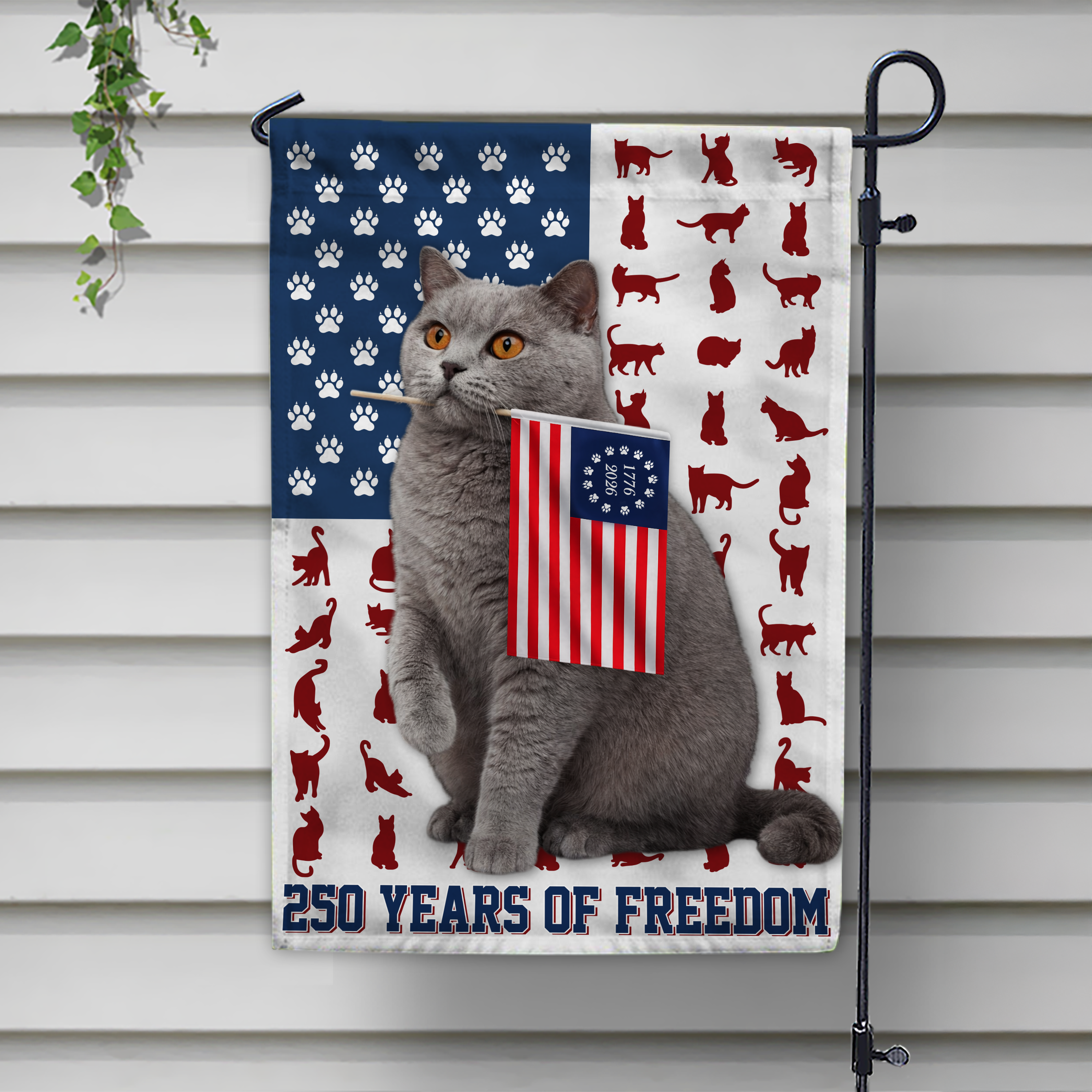 Celebrate your feline friend's patriotic spirit with this custom photo garden flag featuring your beloved cat alongside America's 250-year legacy of freedom. Perfect for displaying your pet's personality while honoring national pride, this vibrant flag brings together two things you love—your cat and country. Crafted for outdoor durability, it's an eye-catching way to show your patriotic side with a personal touch. Ideal for gardens, patios, or porches, this unique flag makes a memorable statement that's sure to spark conversations with neighbors and fellow pet lovers alike.