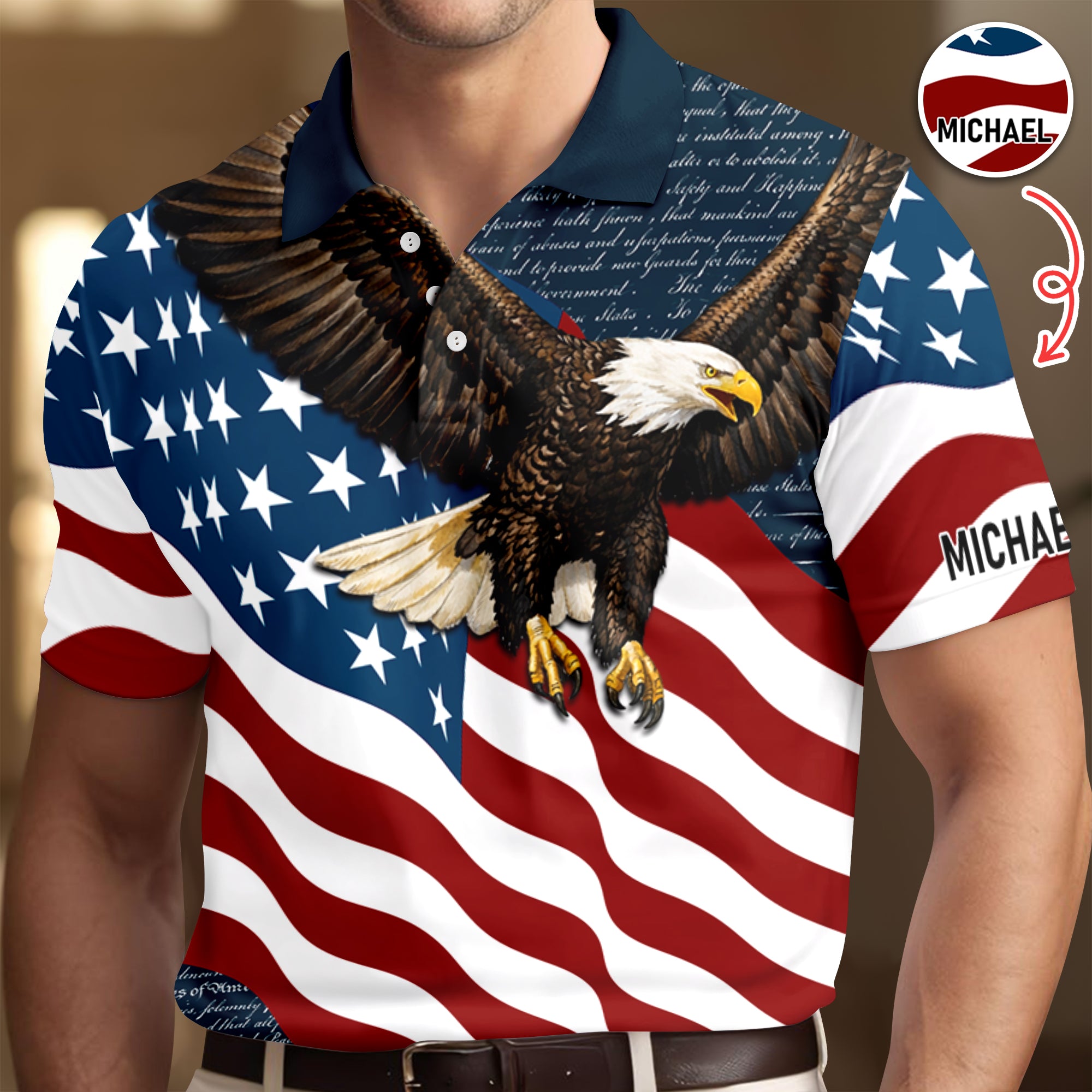 Celebrate patriotism with style in this personalized eagle polo shirt. Custom-embroidered with your name, it blends American pride with timeless elegance. Perfect gift for veterans, flag enthusiasts, or anyone who loves country. Premium quality ensures lasting wear and comfort.