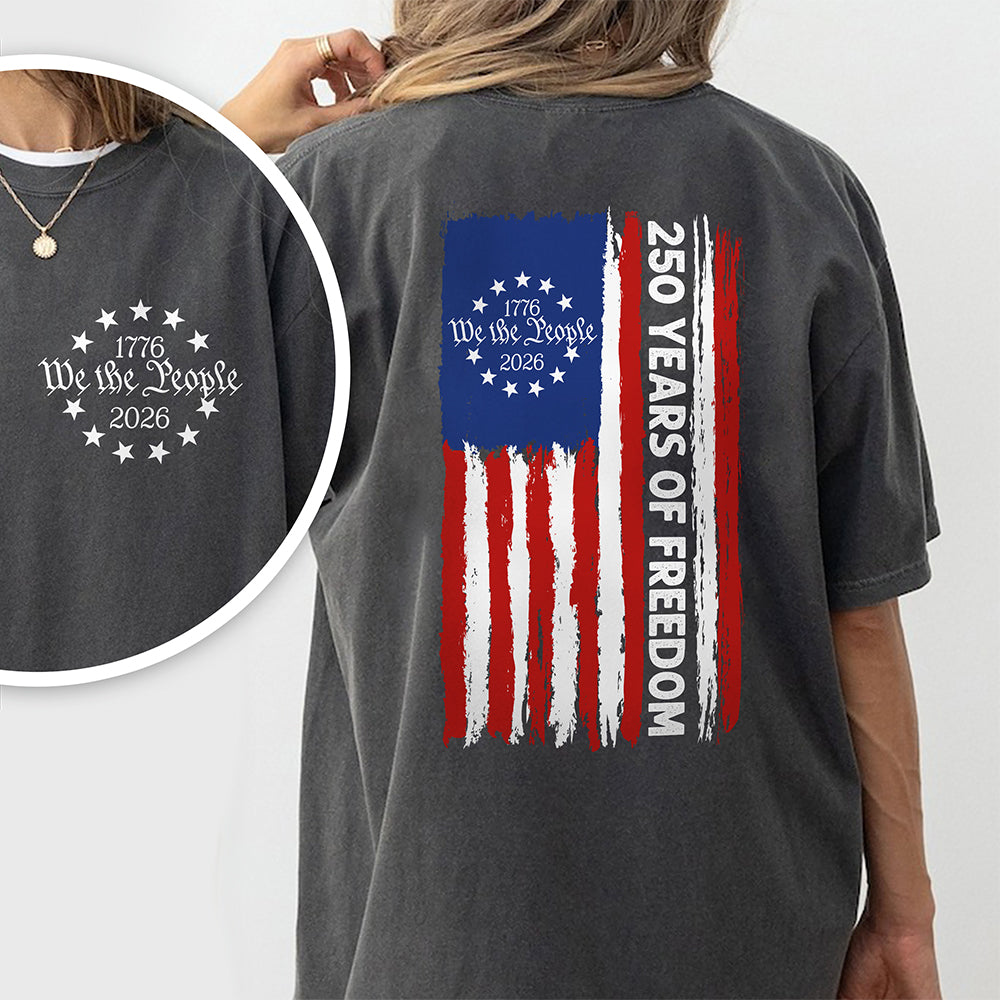 Celebrate America's legacy with this patriotic We the People T-Shirt, honoring 250 years of freedom and independence. Featuring the iconic Betsy Ross flag design on both front and back, this dark shirt makes a bold statement about your pride in the nation's enduring values. Crafted for comfort and durability, it's perfect for Independence Day celebrations, civic events, or everyday wear. Show your patriotic spirit with a classic design that resonates with American history and tradition.