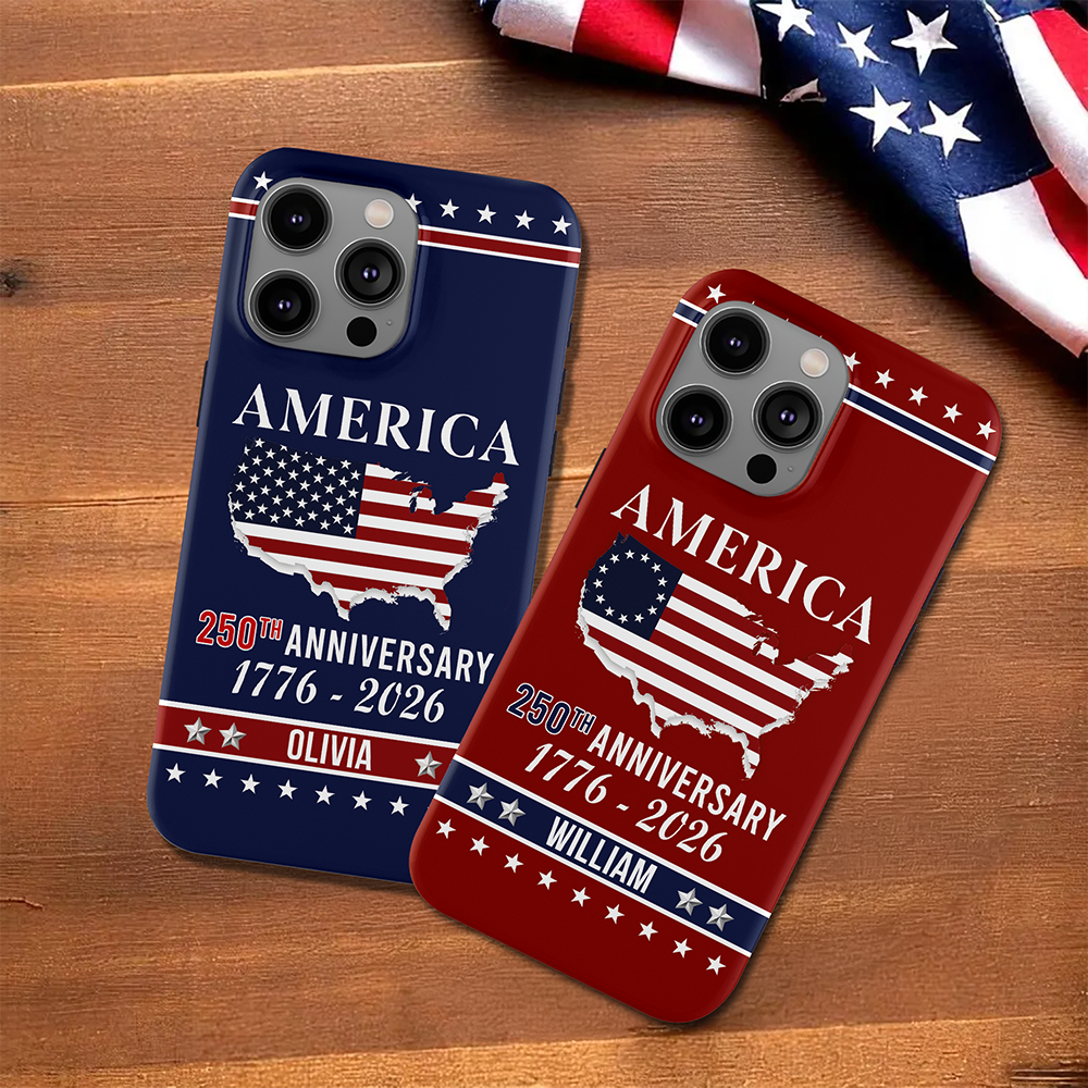 Celebrate America's historic milestone with this striking USA 250th Anniversary Phone Case. Featuring bold patriotic design commemorating 2026's momentous occasion, this case delivers premium protection for your device while making a statement about national pride. Durable construction shields against drops and scratches, while the eye-catching graphics ensure your phone stands out. Perfect for collectors, history enthusiasts, and anyone wanting to honor this once-in-a-lifetime celebration. Carry a piece of American heritage with style and confidence.