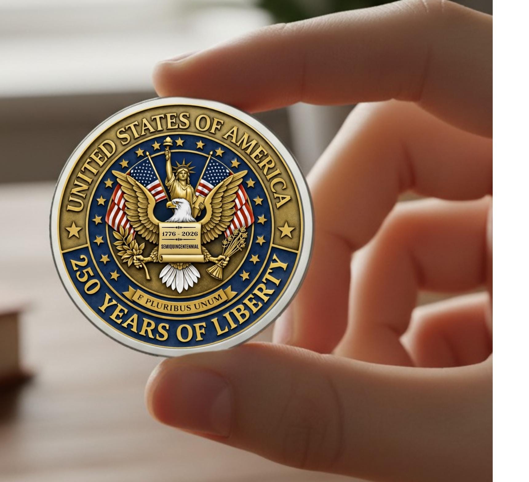 Celebrate America's historic milestone with this striking 250th Anniversary Commemorative Challenge Coin. Featuring a unique design that honors the nation's journey from 1776 to 2026, this collectible piece makes an exceptional gift for history enthusiasts, patriots, and coin collectors alike. With its distinctive specification, this coin stands out as a meaningful keepsake that captures a once-in-a-lifetime moment in American history. Perfect for displaying, gifting, or adding to any collection, it's a tangible way to commemorate the United States' remarkable legacy and enduring spirit.