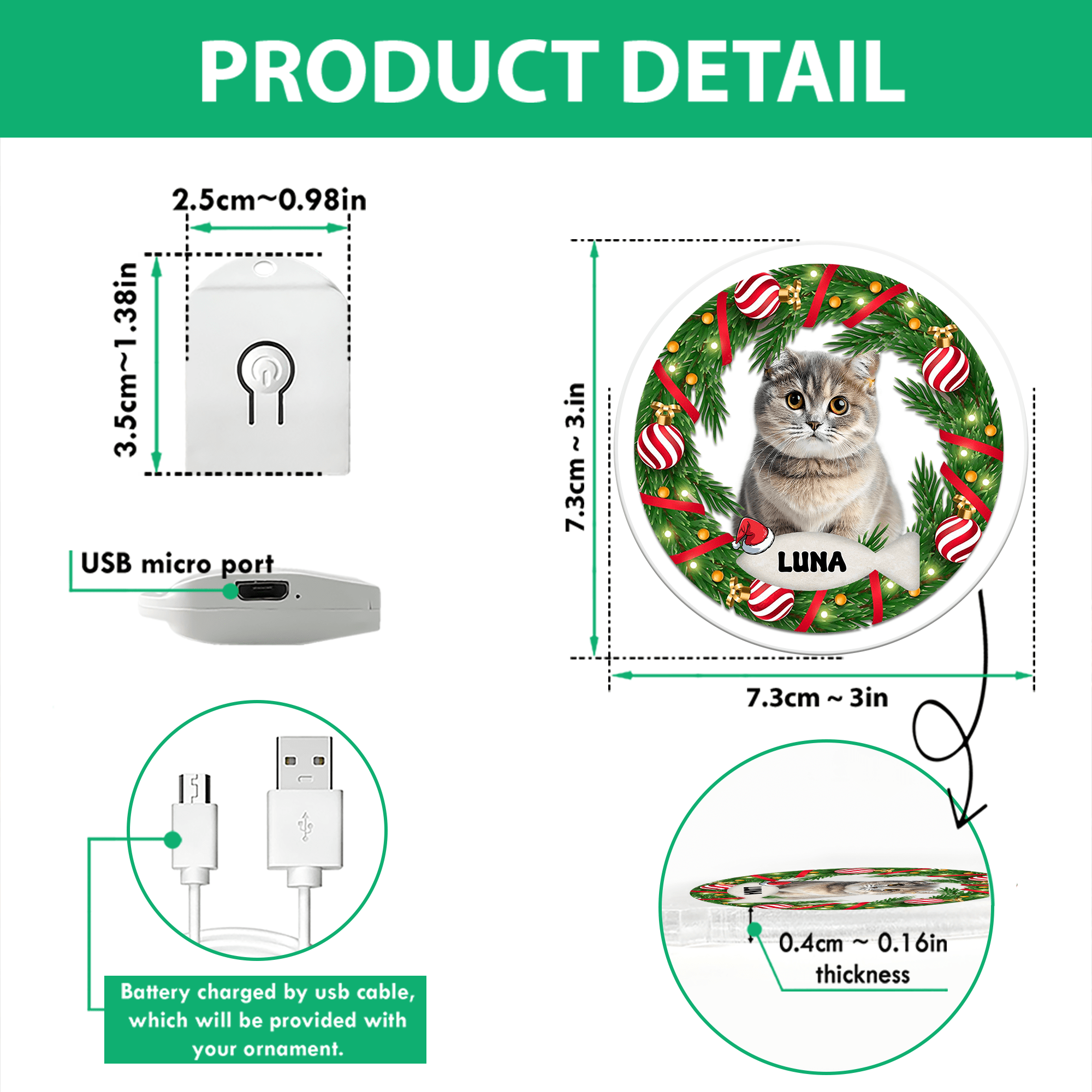 • Each ornament comes with a color-changing button, a golden hanging string, and a bonus micro USB charging cable (with a battery life of 4-6 hours).