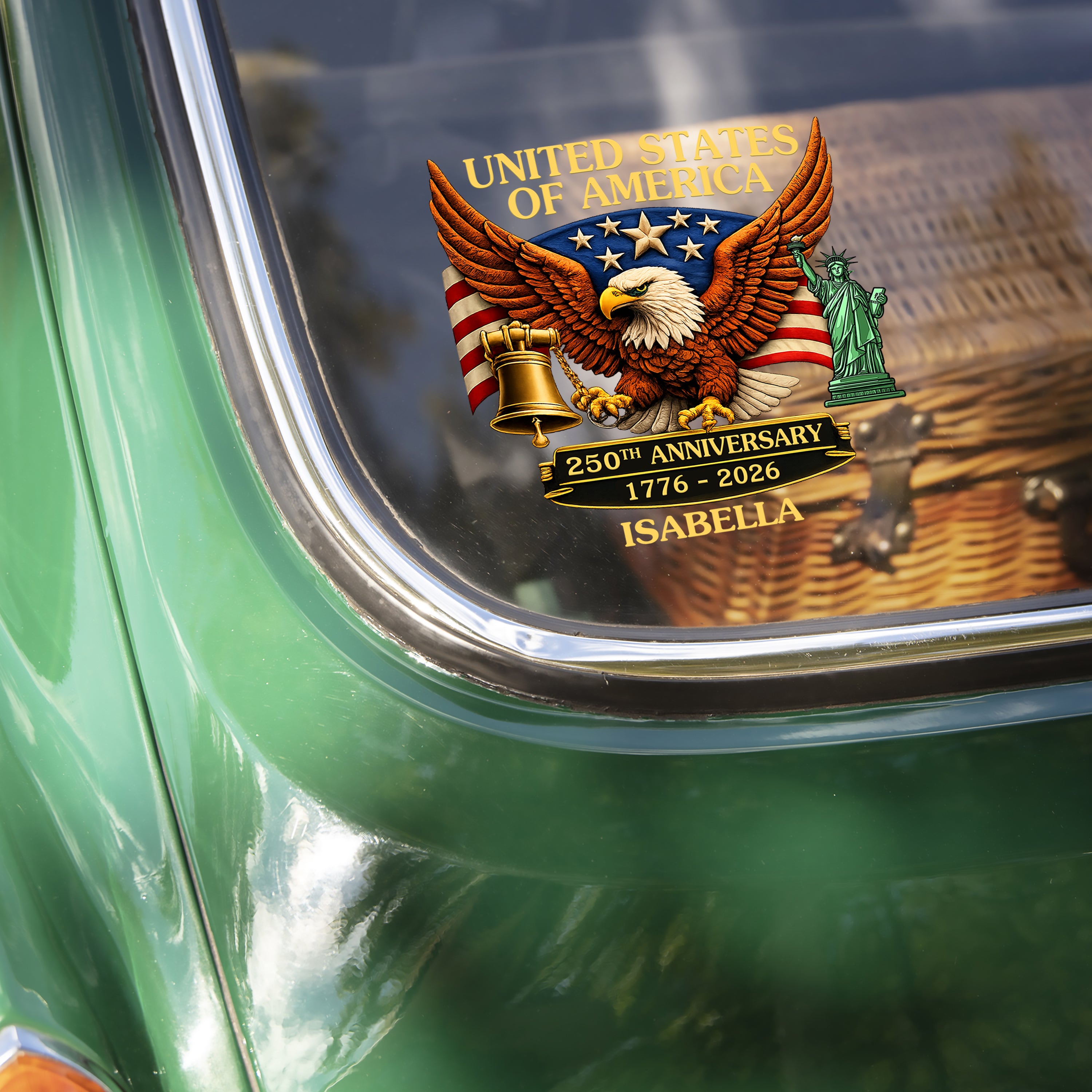 Celebrate America's historic milestone with this striking car window decal commemorating 250 years of freedom. Featuring bold "1776-2026" typography, this durable sticker makes a patriotic statement on any vehicle. Easy to apply and built to withstand weather and road conditions, it's the perfect way to show your pride during this momentous anniversary year. Display your American spirit wherever you drive.