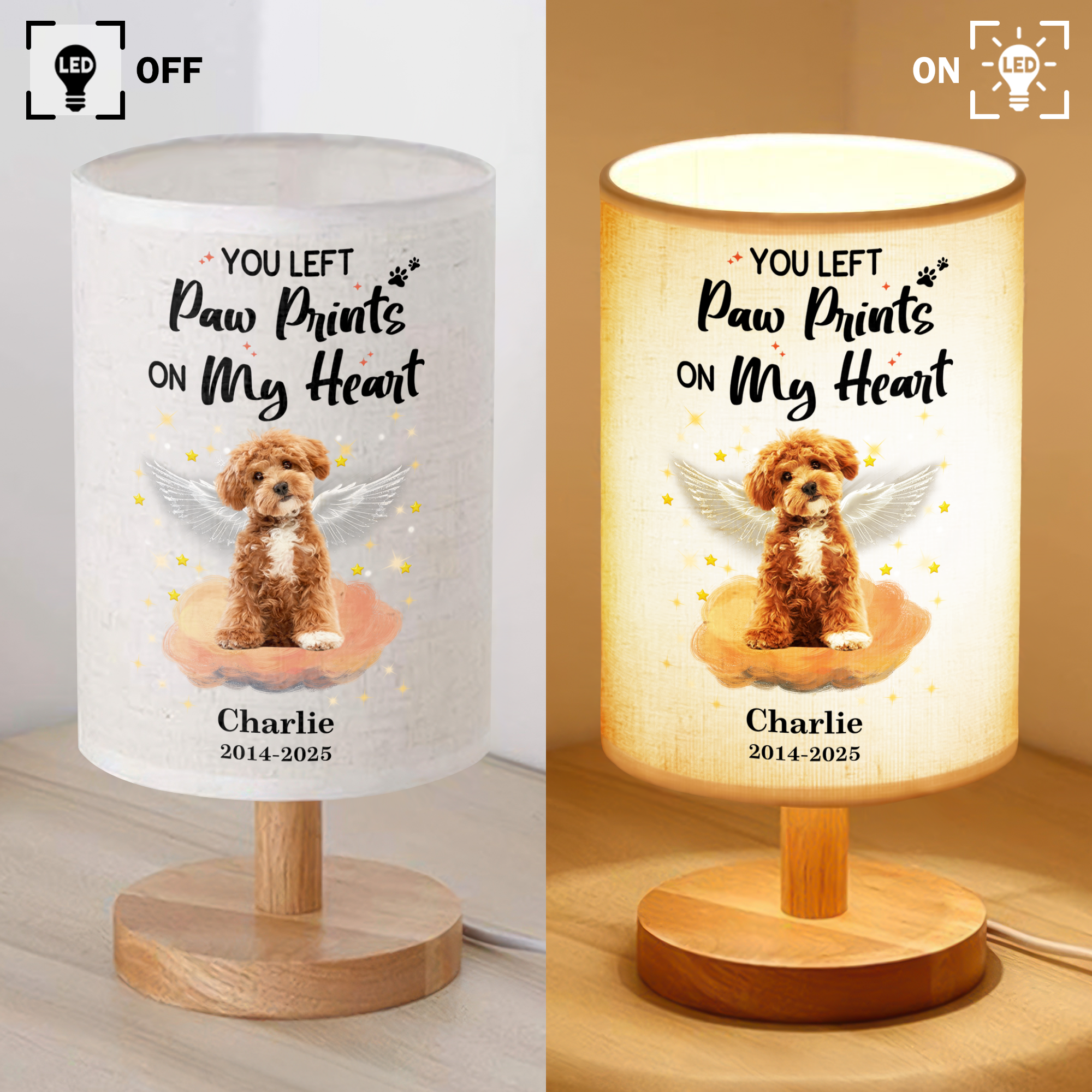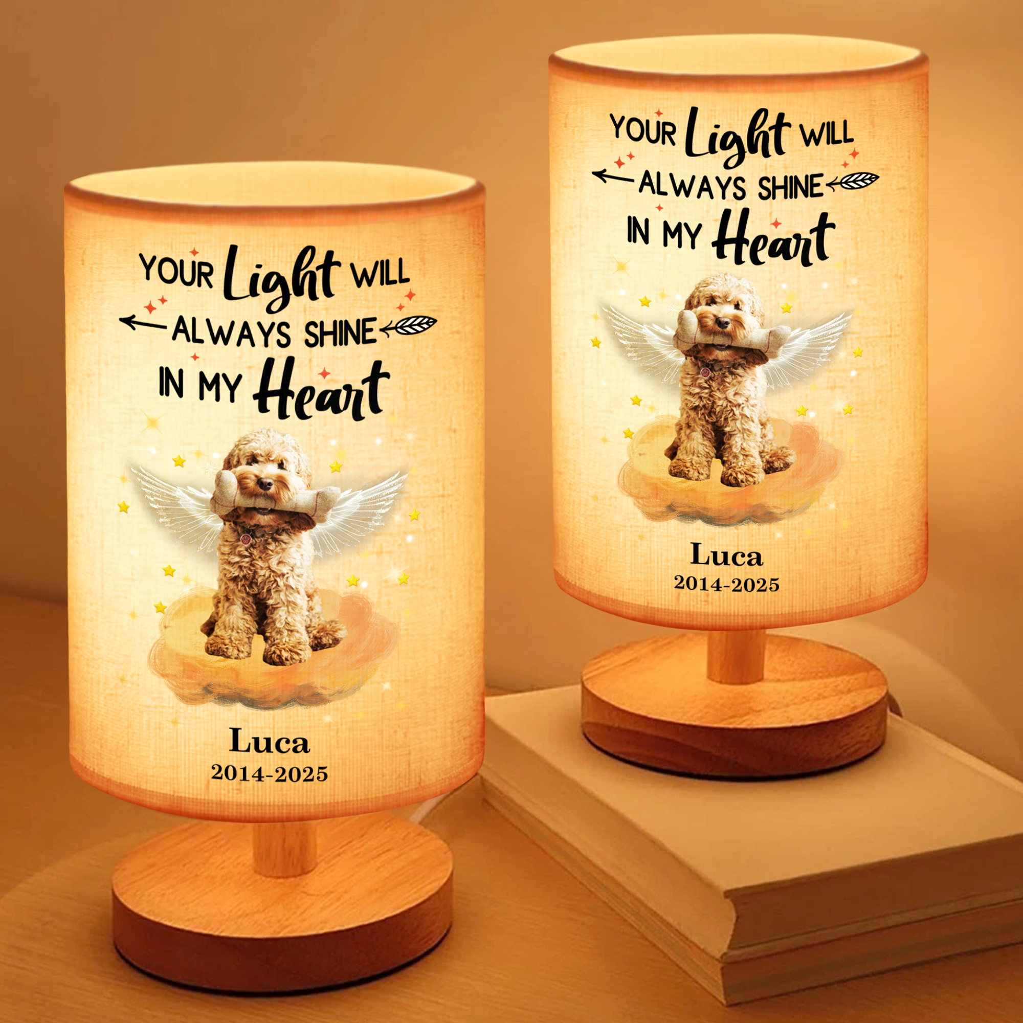 Remember your beloved dog with our Custom Photo Dog Memorial Lamp! The fabric lamp features a personal photo and the heartfelt message "Your light will always shine in my heart." Keep their memory alive with this special keepsake.
