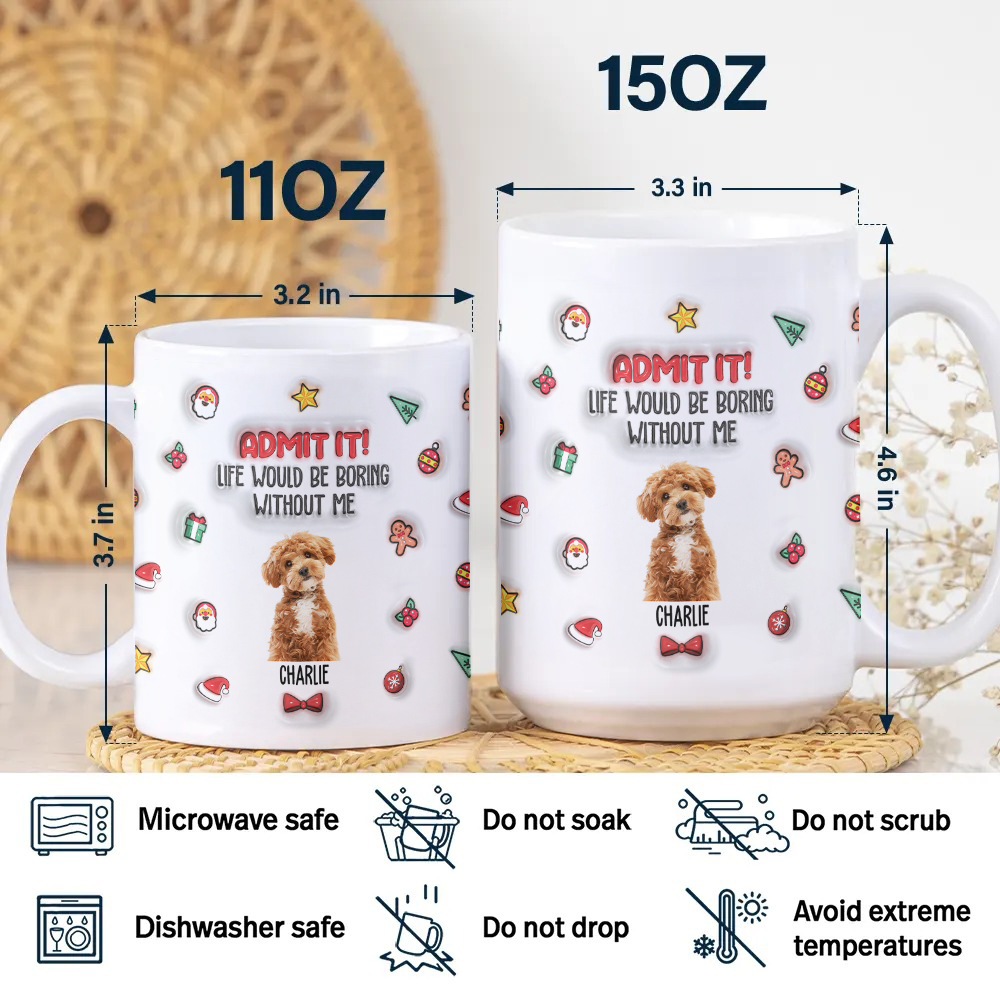 Enjoy your favorite drink with a personal touch using this Custom Photo Admit It! Life Would Be Boring Without Me Personalized 3D Mug. Featuring a unique 3D design, this mug brings your pet’s photo to life, making every sip special. Perfect for pet lovers, it adds charm and personality to your daily routine or makes a thoughtful gift that celebrates the joy your pet brings. Durable and eye-catching, this mug turns ordinary moments into memorable ones.
