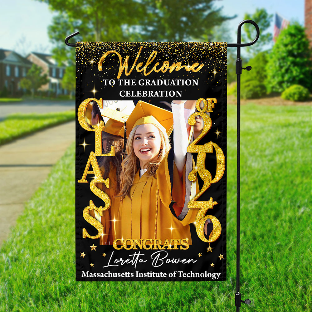 Celebrate the Class of 2026 with this stunning custom photo graduation garden flag. Featuring personalized imagery and eye-catching glitter details, this flag brings festive sparkle to any yard or garden space. Perfect for honoring graduates with a unique, memorable display that captures their special milestone. Weather-resistant design ensures lasting beauty throughout the season. Make their achievement shine bright with this one-of-a-kind keepsake flag.