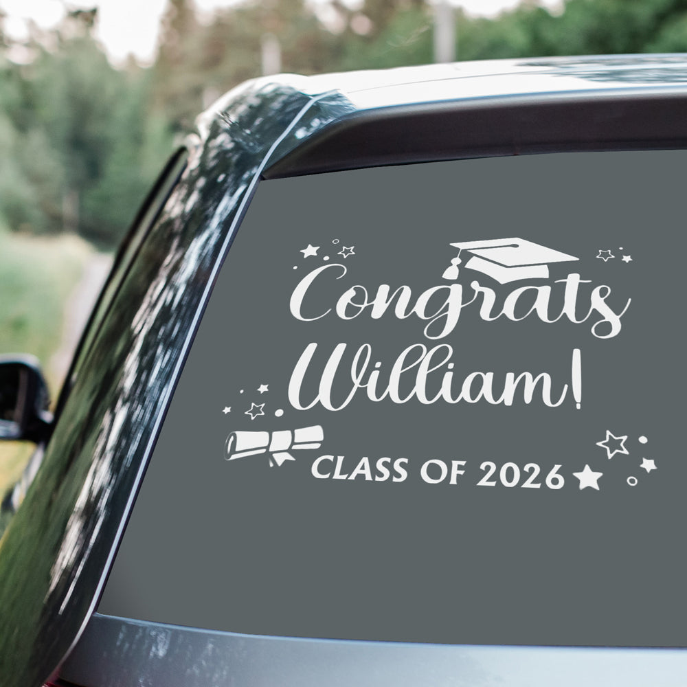 Celebrate your graduate's milestone with this custom car window decal that puts their name front and center. Perfect for proud parents and family members, this personalized sticker announces their Class of 2026 achievement wherever you drive. Made with durable vinyl that withstands weather and road conditions, it adheres cleanly to any car window without residue. Display your pride with style—a thoughtful way to honor their hard work and accomplishment. Order today and make their graduation moment visible to everyone on the road.