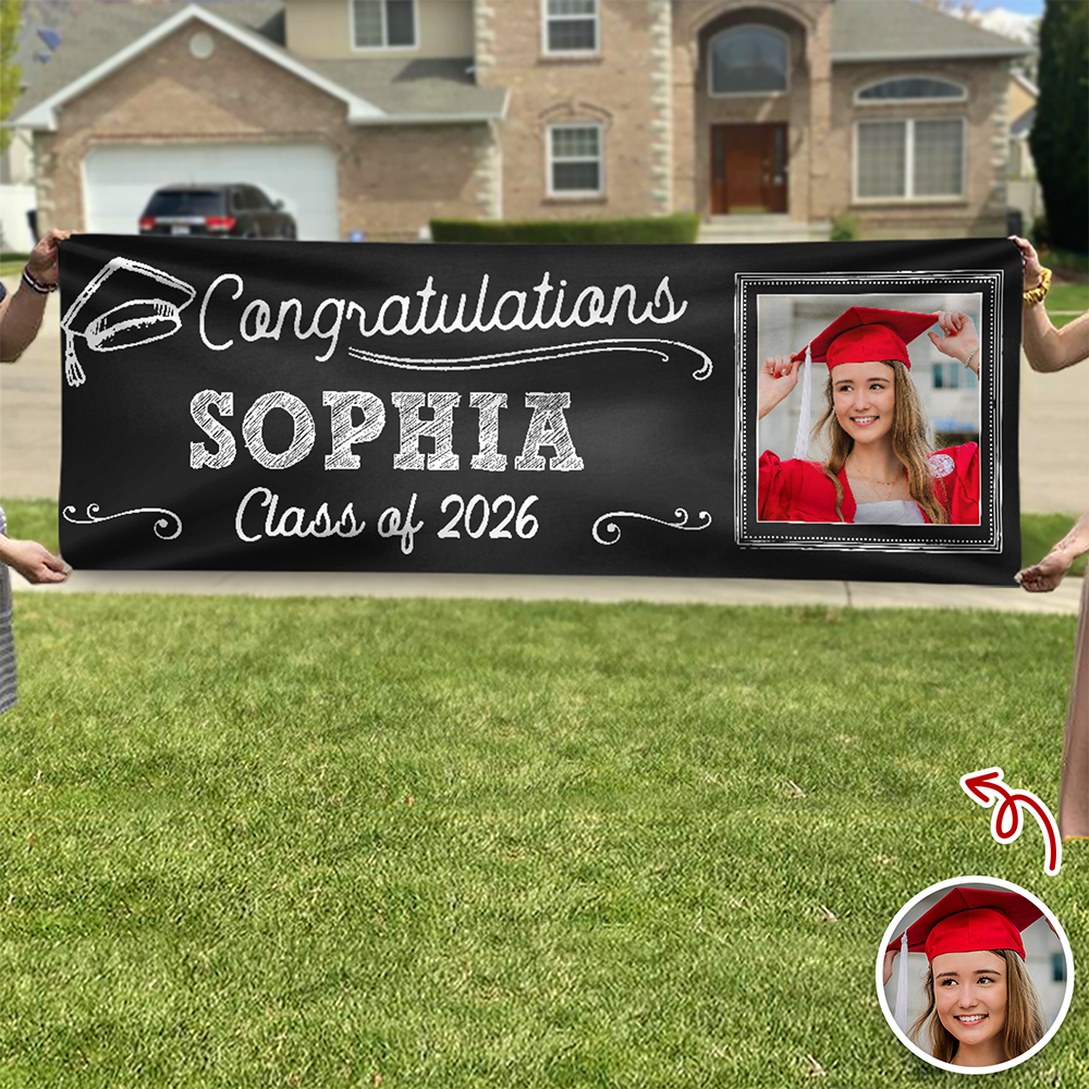 Celebrate the Class of 2026 with this personalized photo graduation banner, designed to make your party decorations truly special. Customize it with your favorite photo to create a unique and memorable display for the big day. Perfect for graduation parties, photo backdrops, or home celebrations, this banner adds a festive touch while capturing the joy and pride of this important milestone.