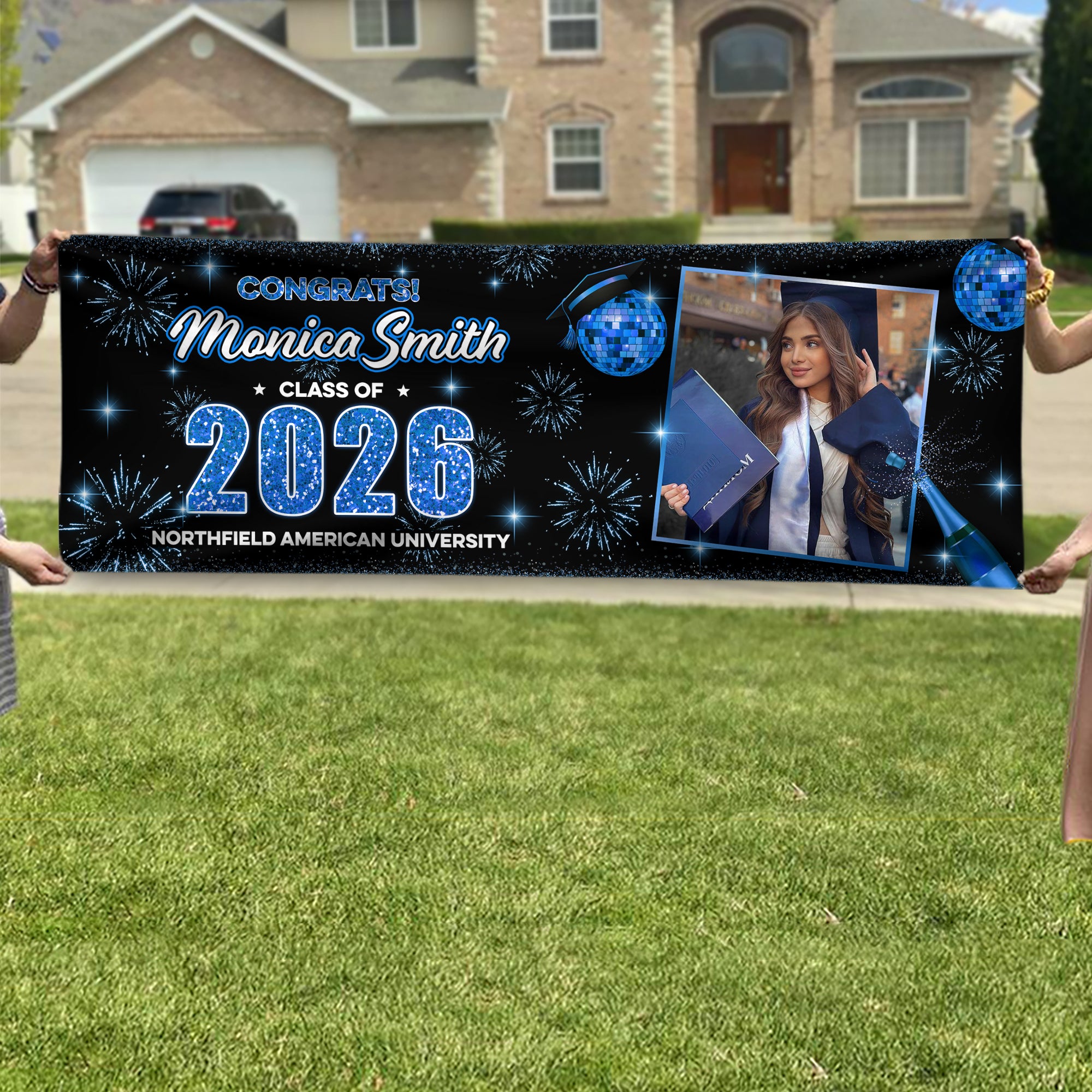 Celebrate your Class of 2026 with a personalized graduation banner that captures your special moments. This custom photo banner transforms your favorite graduation photos into a stunning display piece perfect for parties, ceremonies, and memorable gatherings. Featuring vibrant, high-quality printing and durable construction, it's designed to withstand indoor and outdoor celebrations. Create lasting memories with a banner that's as unique as your achievement—customize it with your photos and make your graduation day unforgettable.