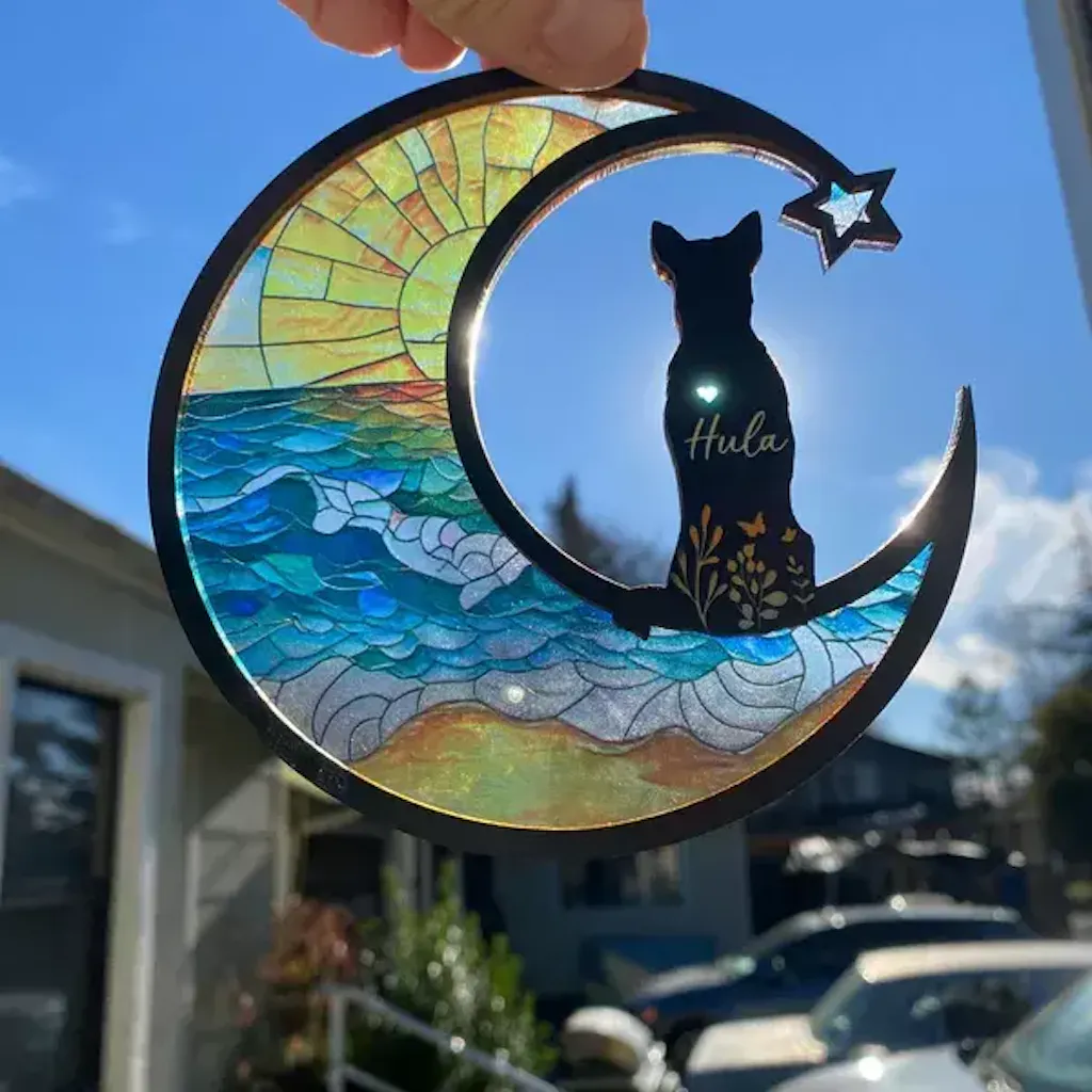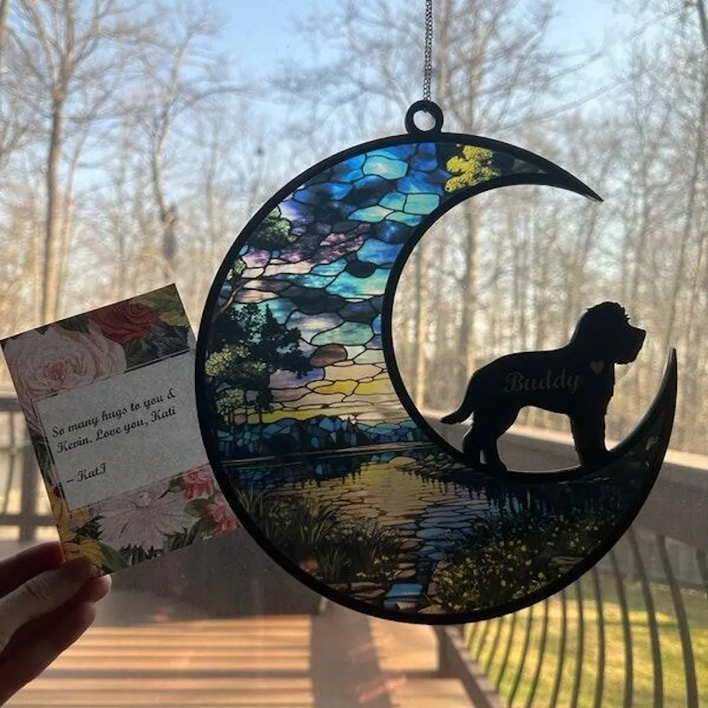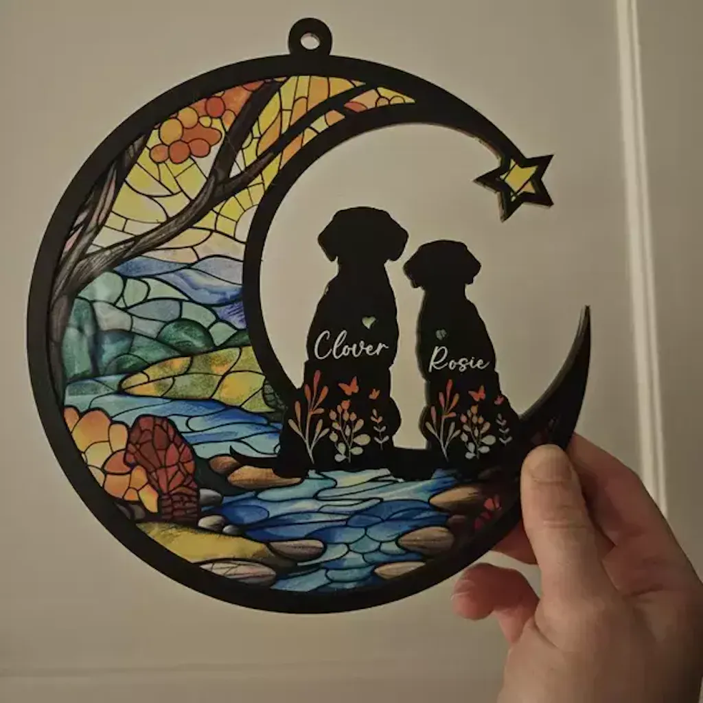The memory of your cherished pet can be honored with the help of this customized dog memorial suncatcher. This tribute, which was made with respect and attention to detail by a dog lover, helps guarantee that treasured memories of your pet will endure forever. Feel your pet's love shine through the lovely, bright designs by hanging it in a special location.