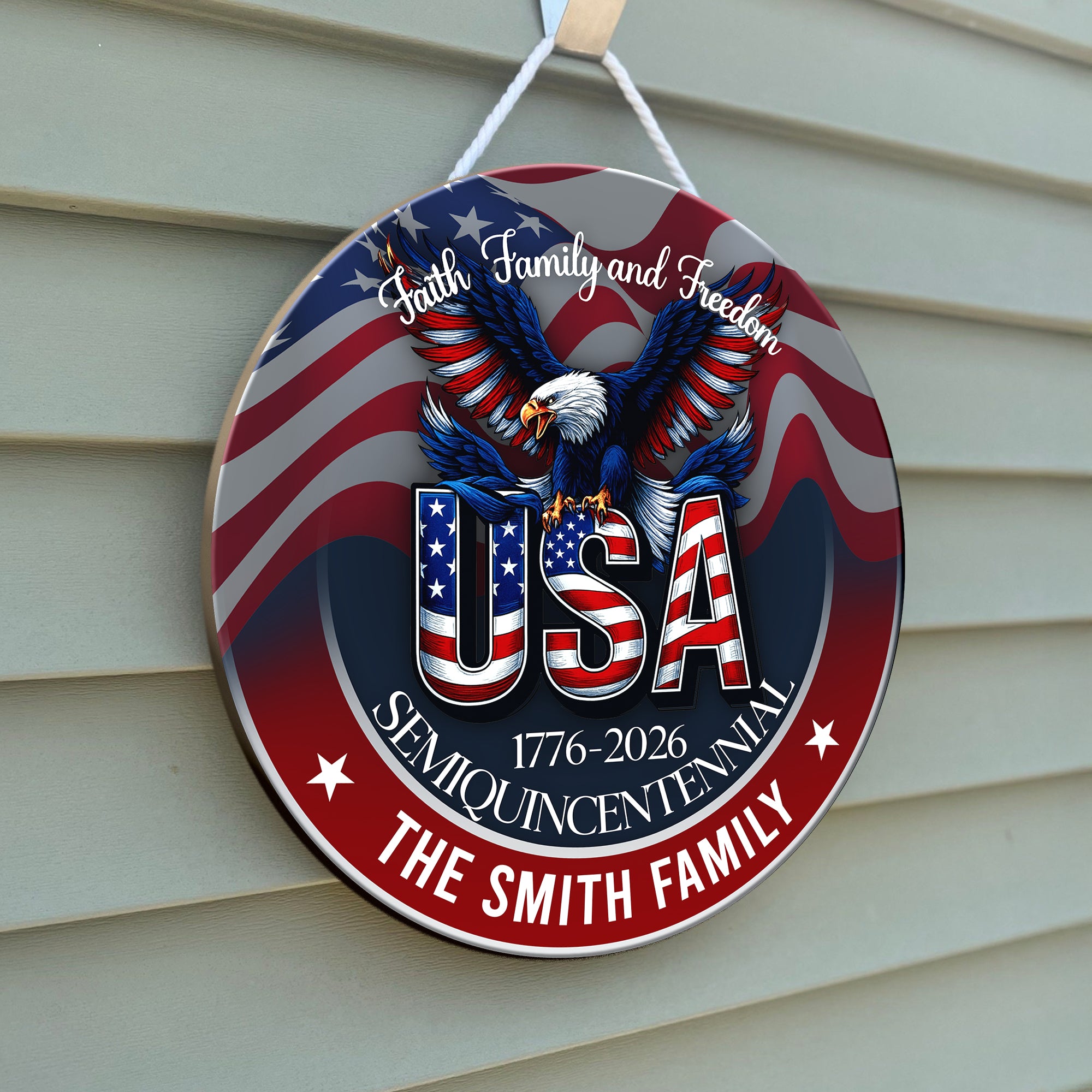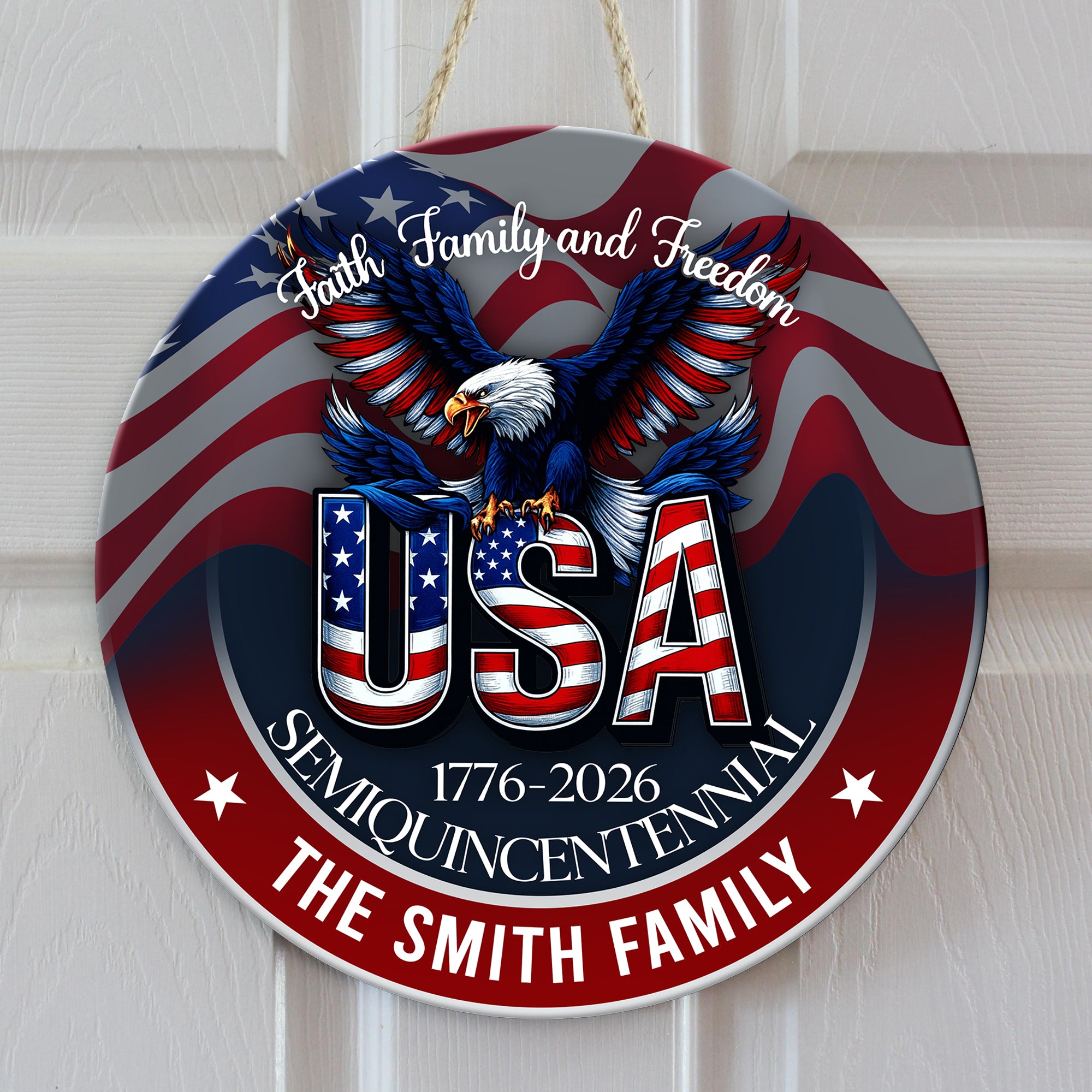 Celebrate America's rich heritage with this striking personalized doorsign commemorating 250 years of history. Custom-crafted to showcase your family name, it blends patriotic pride with elegant home décor. Perfect for entryways, this timeless piece honors the nation's semiquincentennial while adding distinguished character to any space.