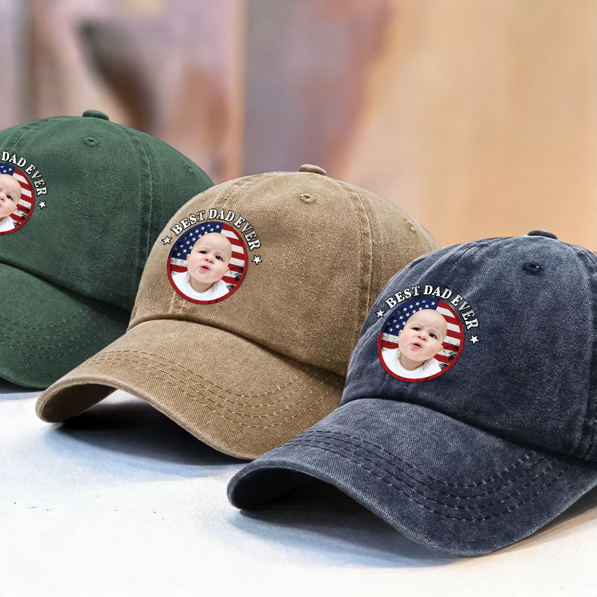 Custom Photo Best Dad Ever With US Flag Washed Denim Baseball Cap HA75 892528