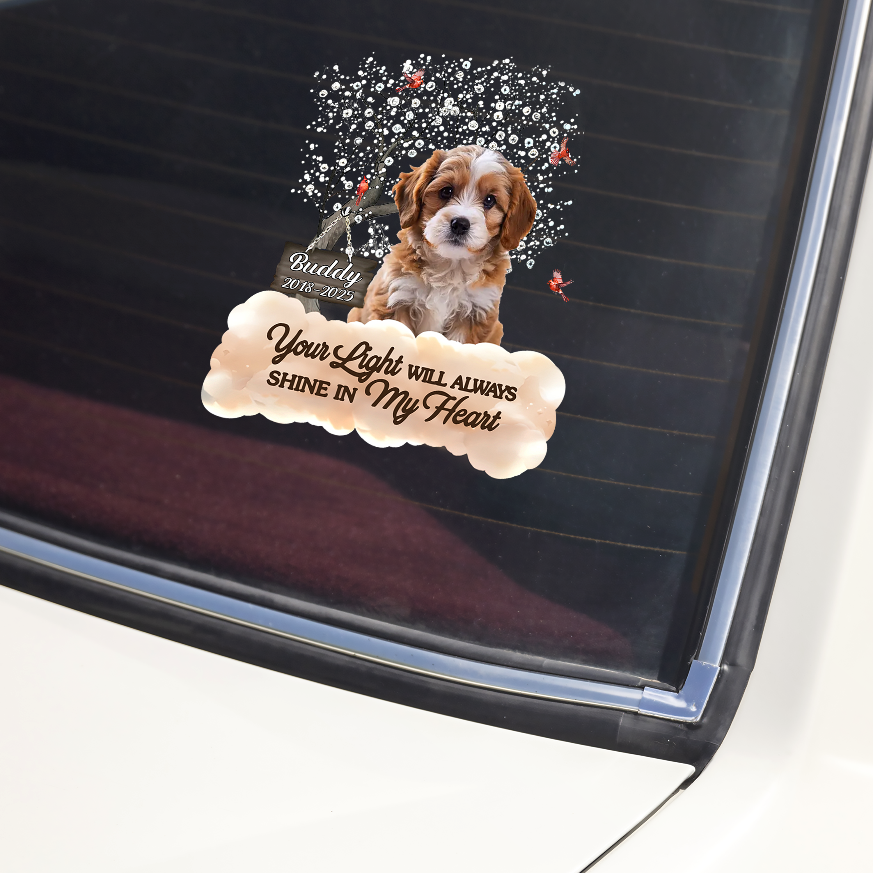 Honor your beloved companion with this custom photo car window decal. Perfect for dog owners who want to keep their cherished memories visible, this personalized sticker transforms any vehicle into a tribute to your furry friend. Made with durable, weather-resistant material, it withstands sun, rain, and road conditions while maintaining vibrant color and clarity. The elegant "In Loving Memory" design adds a touching sentiment that resonates with fellow pet lovers. Easy to apply and remove without residue, this meaningful gift celebrates the bond you shared and keeps your pet's spirit close wherever you drive.