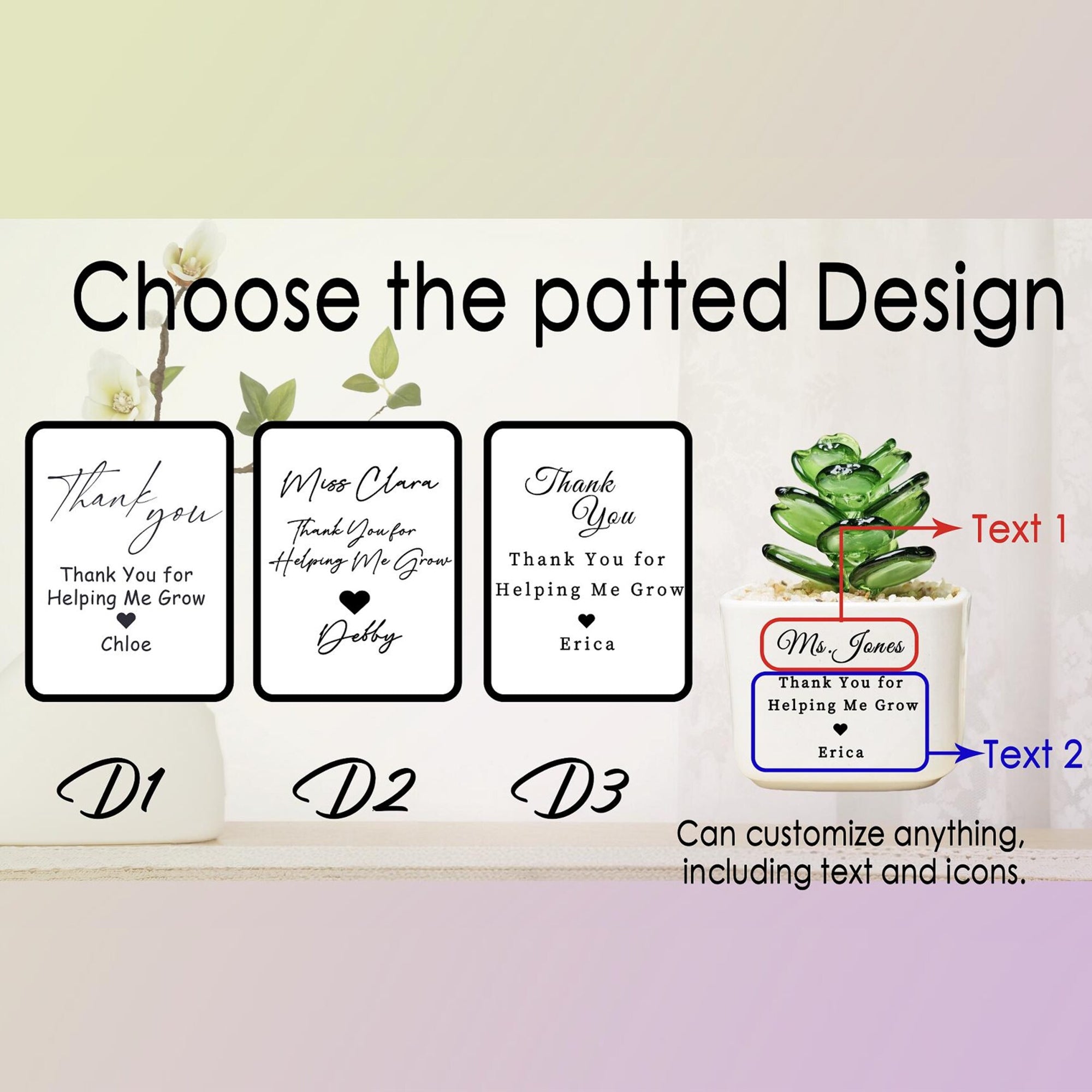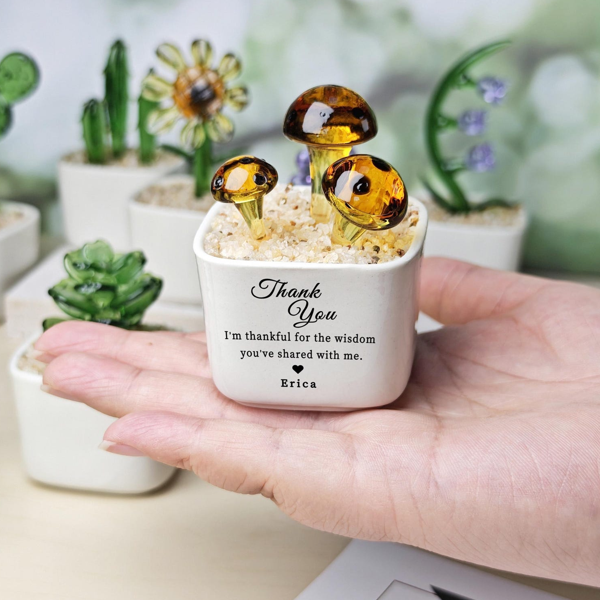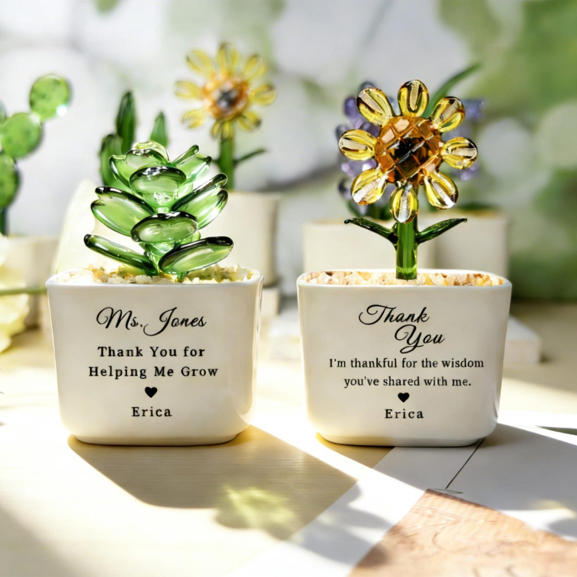 Thank You for Helping Me Grow Tulip Glass Flower Pot – a heartfelt gift that celebrates the special people who've nurtured your success. This charming personalized figurine features a delicate glass tulip design, perfect for teachers, mentors, and cherished friends. Whether displayed on a desk, shelf, or windowsill, it serves as a lasting reminder of gratitude and appreciation. Ideal for Teacher Appreciation Day, Valentine's Day, or any occasion when you want to express genuine thanks. The elegant succulent cactus aesthetic adds a modern touch to any space. Give a gift that speaks volumes about your appreciation and strengthens meaningful relationships.