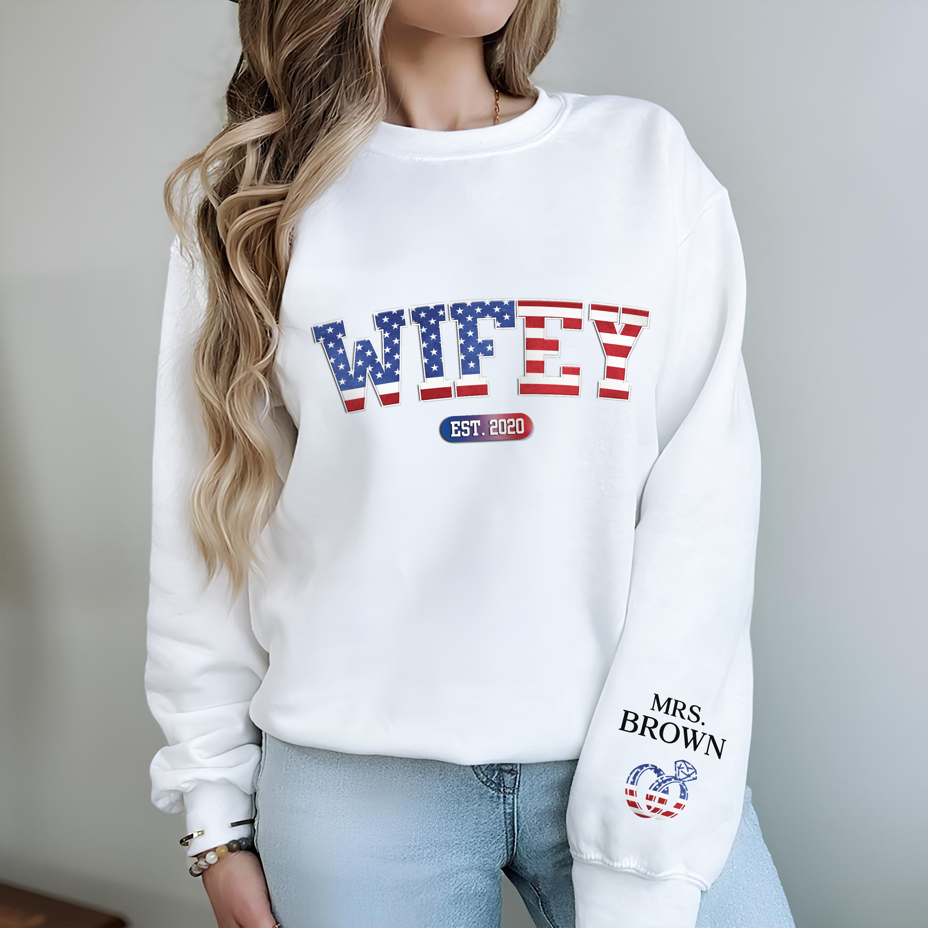 Celebrate your love story with this custom personalized "Wifey Est" sweatshirt, the perfect anniversary gift for couples. Featuring a stylish design on the sleeve, it's a wearable reminder of your special bond. Cozy, comfortable, and uniquely yours—ideal for creating lasting memories together.