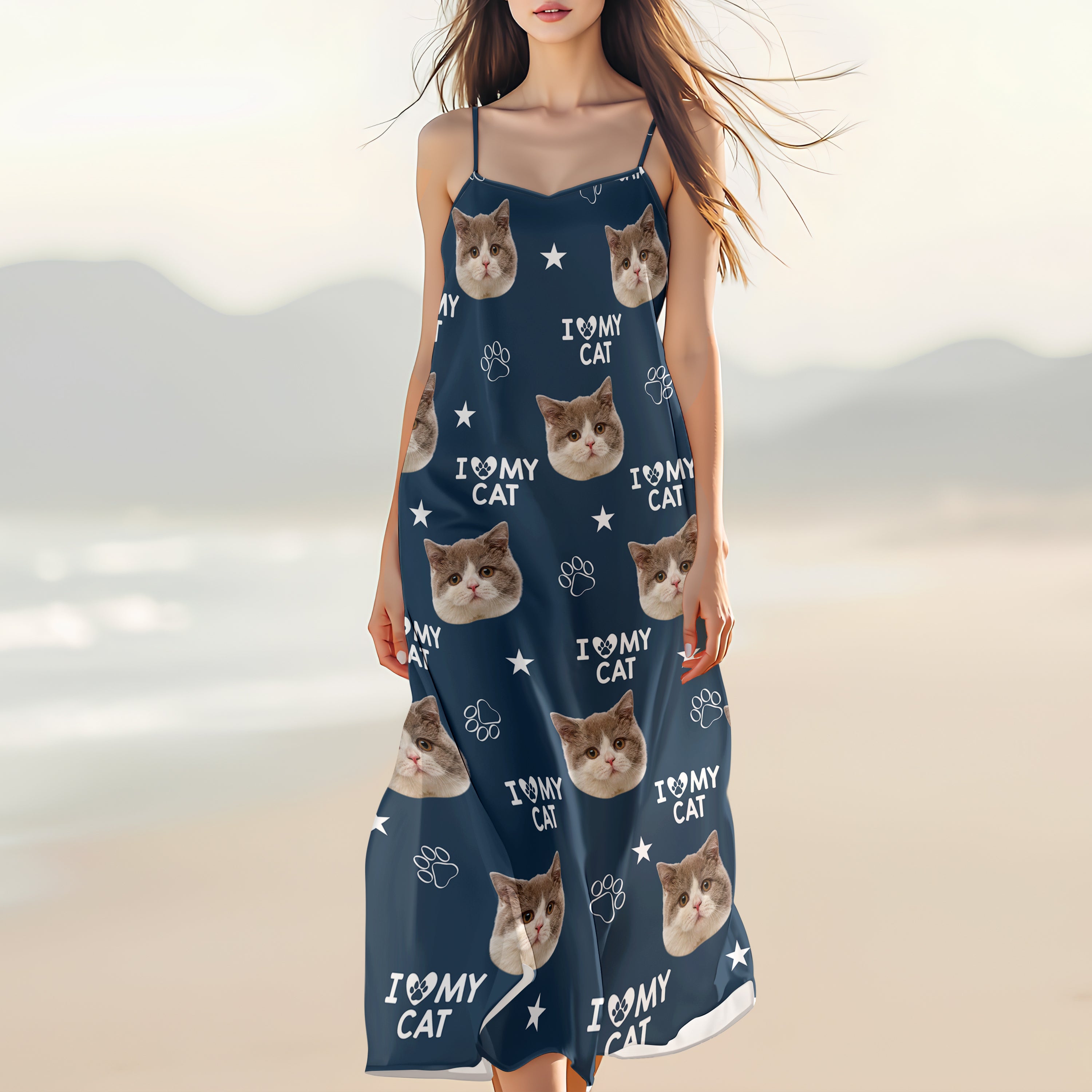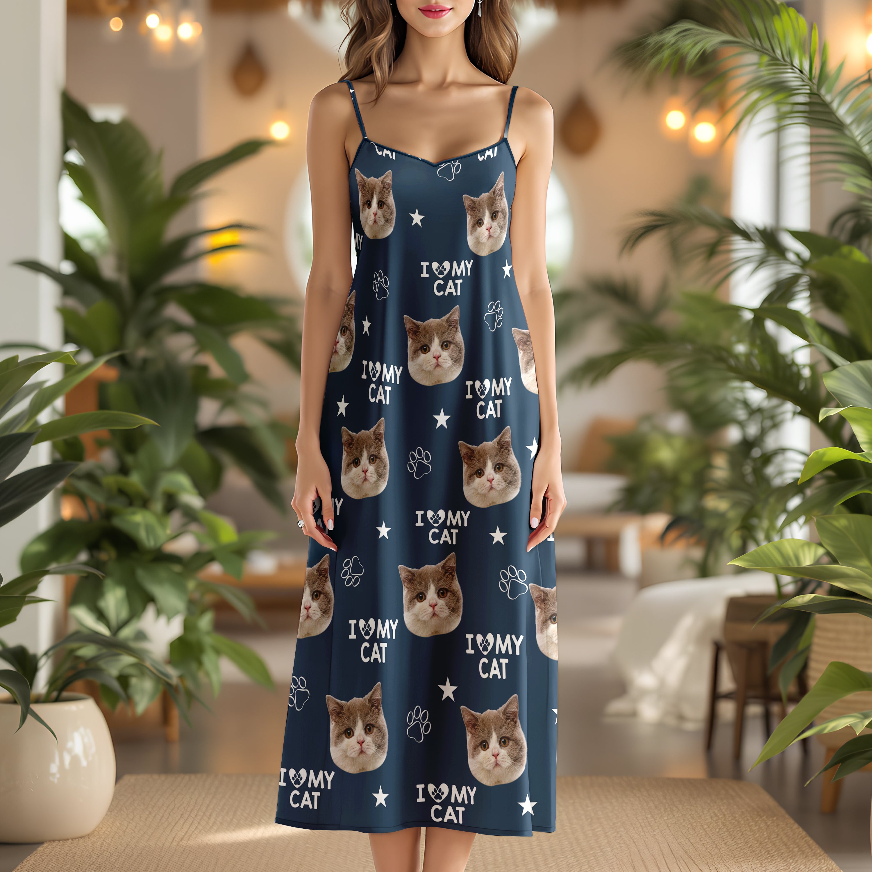 Show off your love for your furry friends with our Custom Photo and Name I Love My Cats Maxi Dress! This V-Neck Cami dress is the perfect gift for any cat lover. Add a personal touch with a custom photo and name, making it a truly unique piece. Embrace your passion and style with this must-have dress. Order yours today!