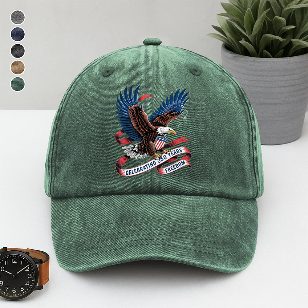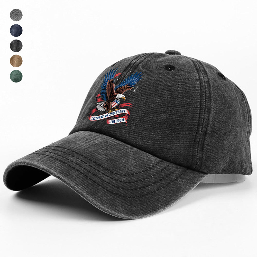 Commemorate American heritage with this distinctive washed denim baseball cap, designed to celebrate 250 years of freedom. Crafted from soft, vintage-washed denim, it delivers authentic style with comfortable all-day wear. The classic baseball cap silhouette features a structured front panel and curved bill, perfect for casual outings, patriotic events, or everyday adventures. Whether you're showing your pride or simply seeking a timeless accessory, this cap combines nostalgic charm with modern comfort. Make a statement while enjoying the durability and breathability of quality denim construction.
