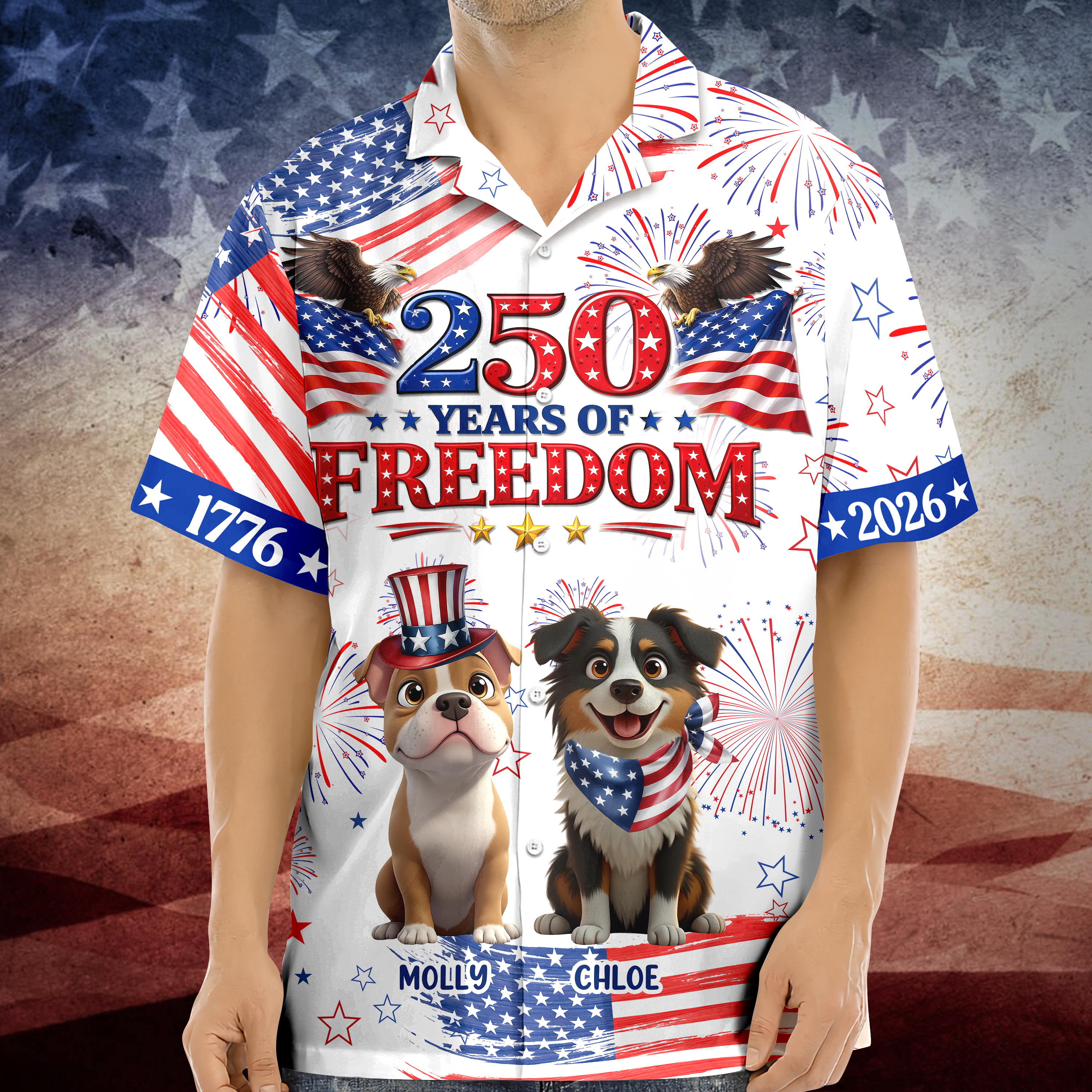 Celebrate America's milestone in style with this vibrant Hawaii shirt featuring patriotic dog designs perfect for the 250th Anniversary. The eye-catching print combines festive Americana imagery with playful canine charm, making it an ideal gift for dog lovers and patriotic enthusiasts alike. Crafted for comfort and durability, this shirt works for casual gatherings, themed parties, or everyday wear. Whether you're heading to a Fourth of July celebration or simply want to show your patriotic spirit, this unique piece delivers personality and pride in one unforgettable package. Give the gift of fun and patriotism combined.