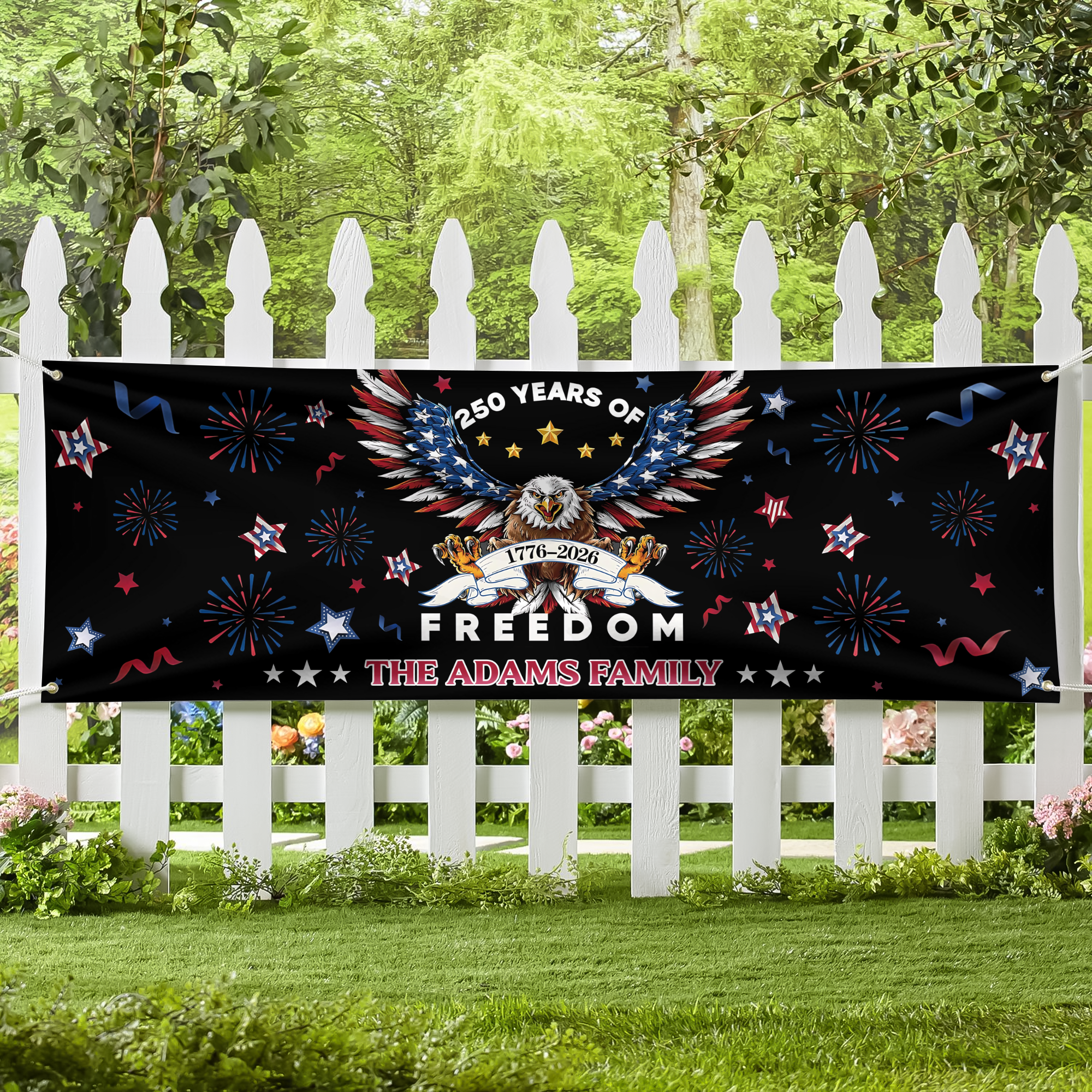 Celebrate America’s 250 years of freedom with this personalized family name banner. Customize it with your family name to create a bold and meaningful patriotic display. Perfect for homes, parties, or outdoor décor, this banner proudly showcases your pride while honoring this historic milestone in style.