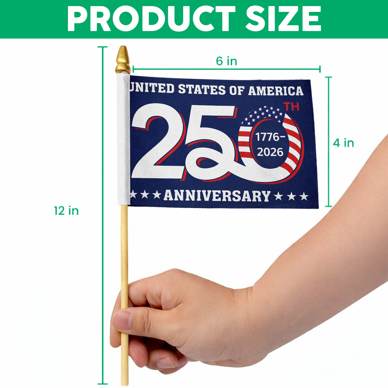 Celebrate America's historic milestone with this striking 250th Anniversary Handheld Flag. Featuring bold patriotic design, this portable flag lets you show your pride at parades, festivals, and commemorative events throughout 2026. Perfect for families, collectors, and history enthusiasts, it's an ideal keepsake of this momentous occasion. Durable construction ensures it withstands outdoor conditions while maintaining vibrant colors. Whether you're marching in a celebration or displaying it at home, this handheld flag captures the spirit of American heritage and unity. Don't miss the chance to own a piece of this once-in-a-generation commemoration.