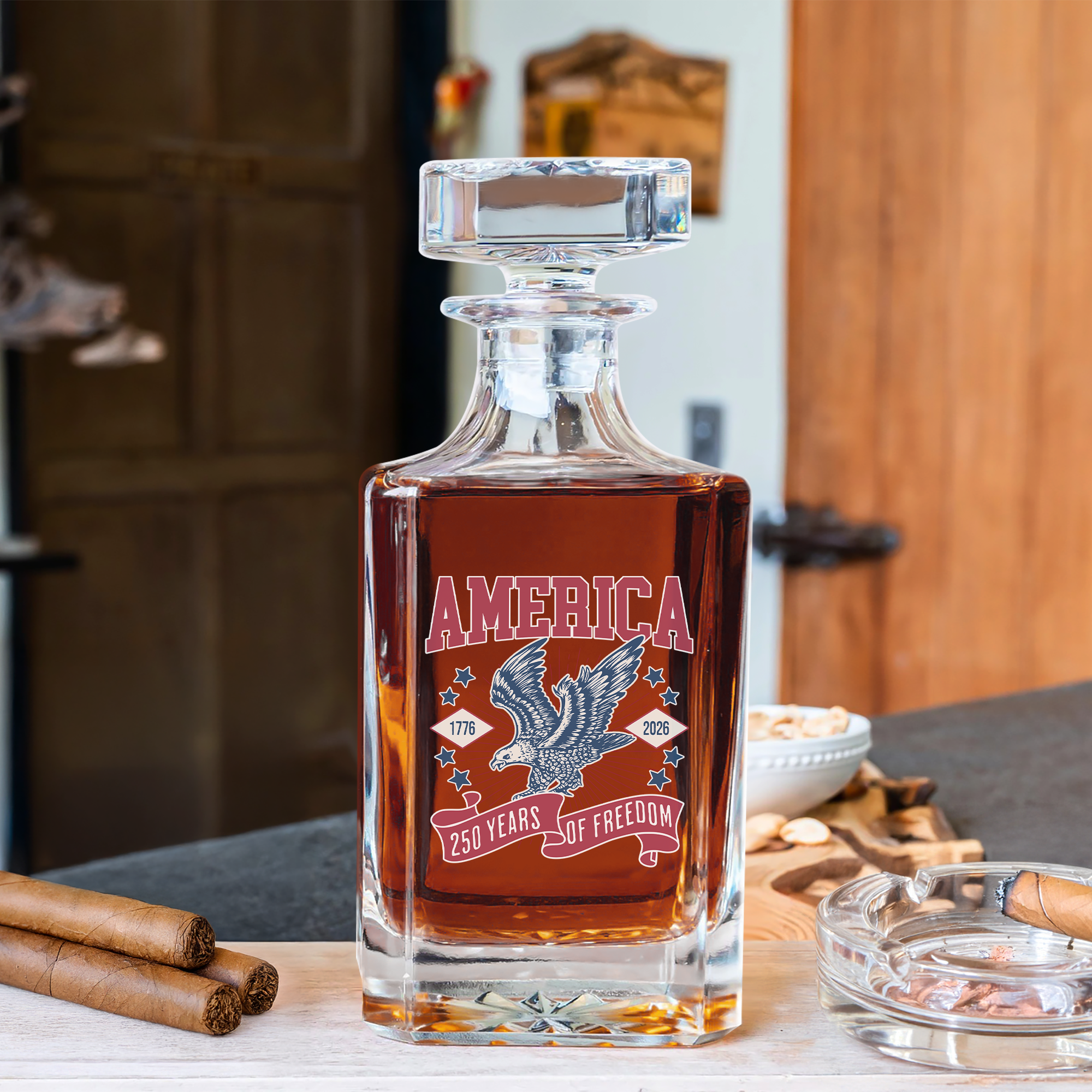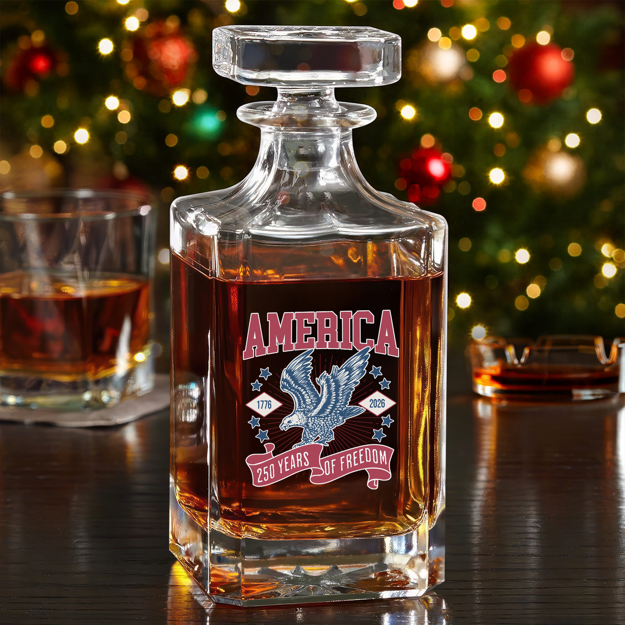 Honor 250 years of American independence with this striking decanter featuring a majestic bald eagle and the iconic USA flag. Crafted to elevate any celebration, it embodies freedom and patriotism, making it a perfect centerpiece for your gatherings or a memorable gift. Celebrate heritage with style and pride.