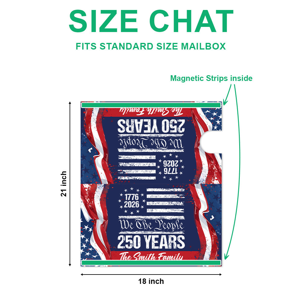 Celebrate America's legacy with this striking personalized mailbox cover, custom-designed to honor the nation's 250th anniversary. Featuring your family name prominently displayed alongside patriotic imagery, this durable cover transforms your mailbox into a meaningful tribute. Perfect for history enthusiasts and proud Americans, it combines functional protection with heartfelt sentiment. Weather-resistant construction ensures lasting beauty through every season. An ideal gift for homeowners who appreciate both patriotism and personalization, this unique piece sparks conversation while safeguarding your mail. Make your home's entrance a statement of family pride and national pride.
