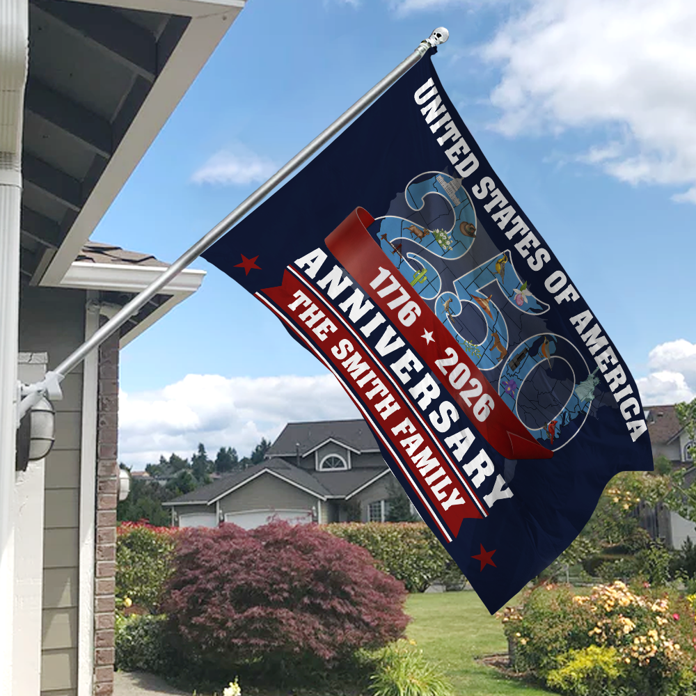 Honor America's 250th Anniversary with this personalized house flag featuring your family name. Display your patriotic pride while celebrating this historic milestone with a custom design that's uniquely yours. Built to withstand outdoor conditions, this vibrant flag brings lasting color and durability to your home's entrance. Transform your porch or garden into a meaningful tribute that combines family identity with national celebration. Make a statement this year with a flag that truly represents who you are.