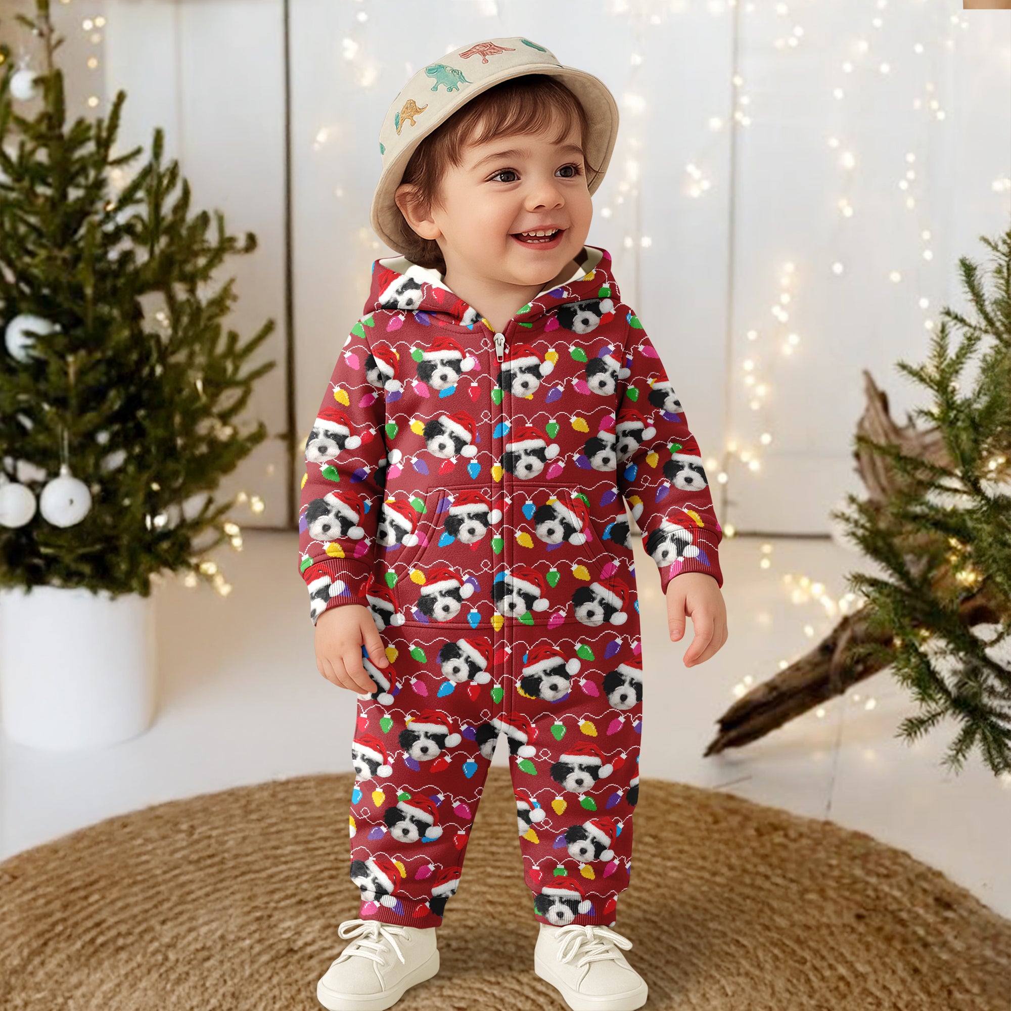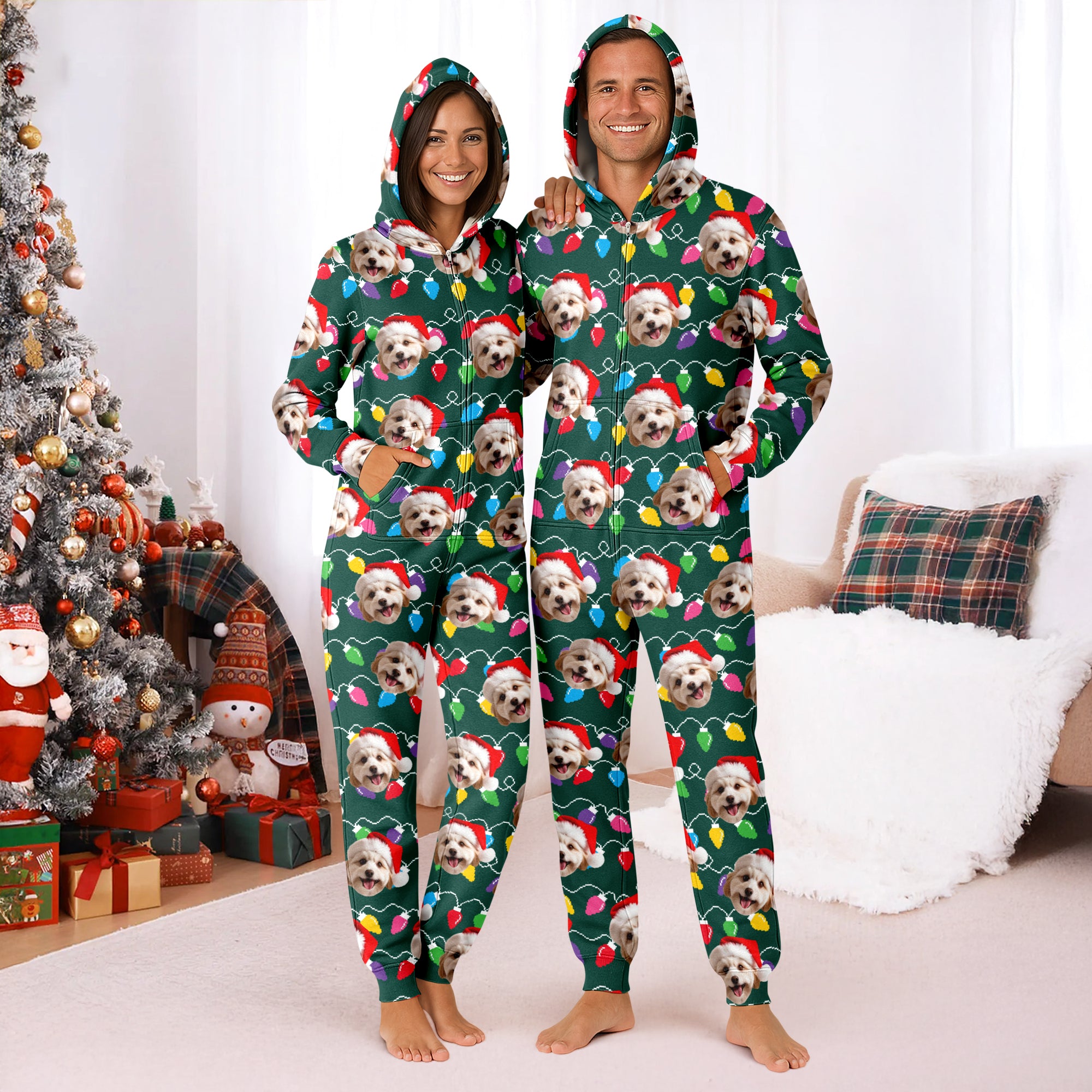 Wrap yourself in festive cheer with these Custom Dog Face Photo Onesie Pajamas, featuring colorful Christmas lights. Perfect for cozy nights or holiday mornings, this unique design lets you showcase your furry friend's face in a playful, vibrant way. Made for comfort and fun, it’s an ideal gift for dog lovers who want to celebrate the season in style. Stay warm and joyful while turning heads with this standout holiday onesie.