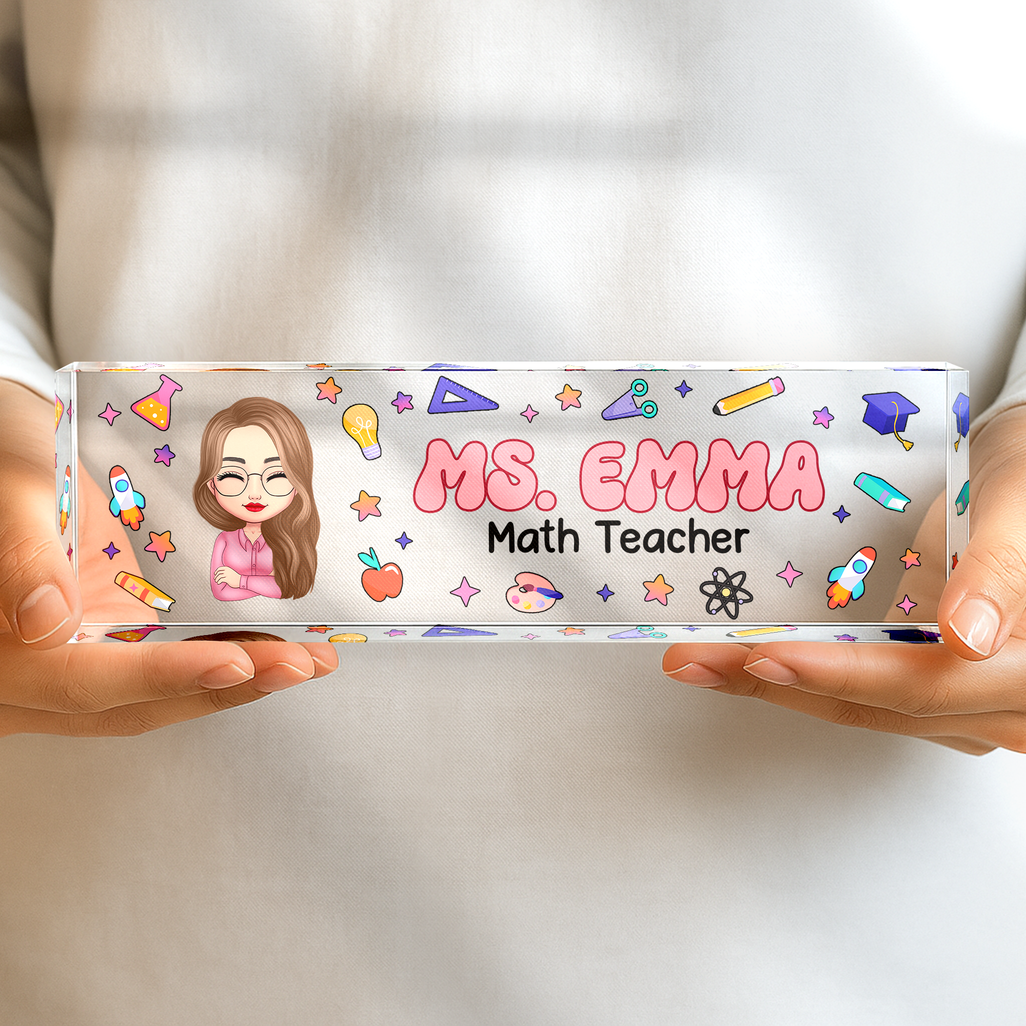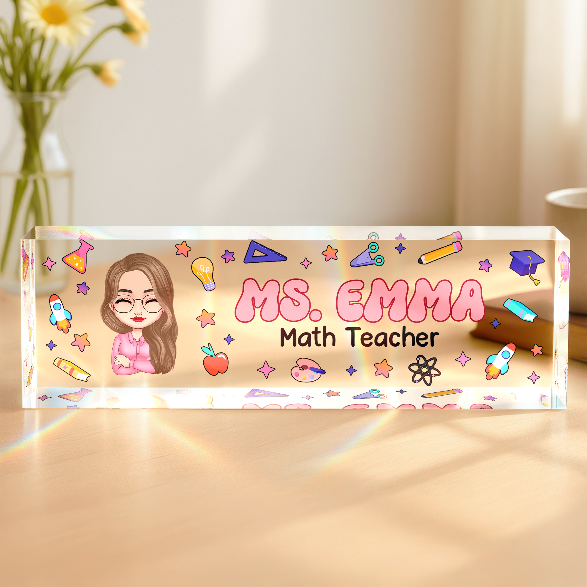 Celebrate your favorite educator with this Personalized Teacher Acrylic Desk Name Plate. Crafted from clear acrylic, it adds a professional and personal touch to any desk. Customizable with the teacher’s name, this elegant name plate makes a thoughtful and lasting gift that shows appreciation for their hard work and dedication. Perfect for classrooms or home offices, it’s a meaningful way to honor teachers and brighten their workspace.