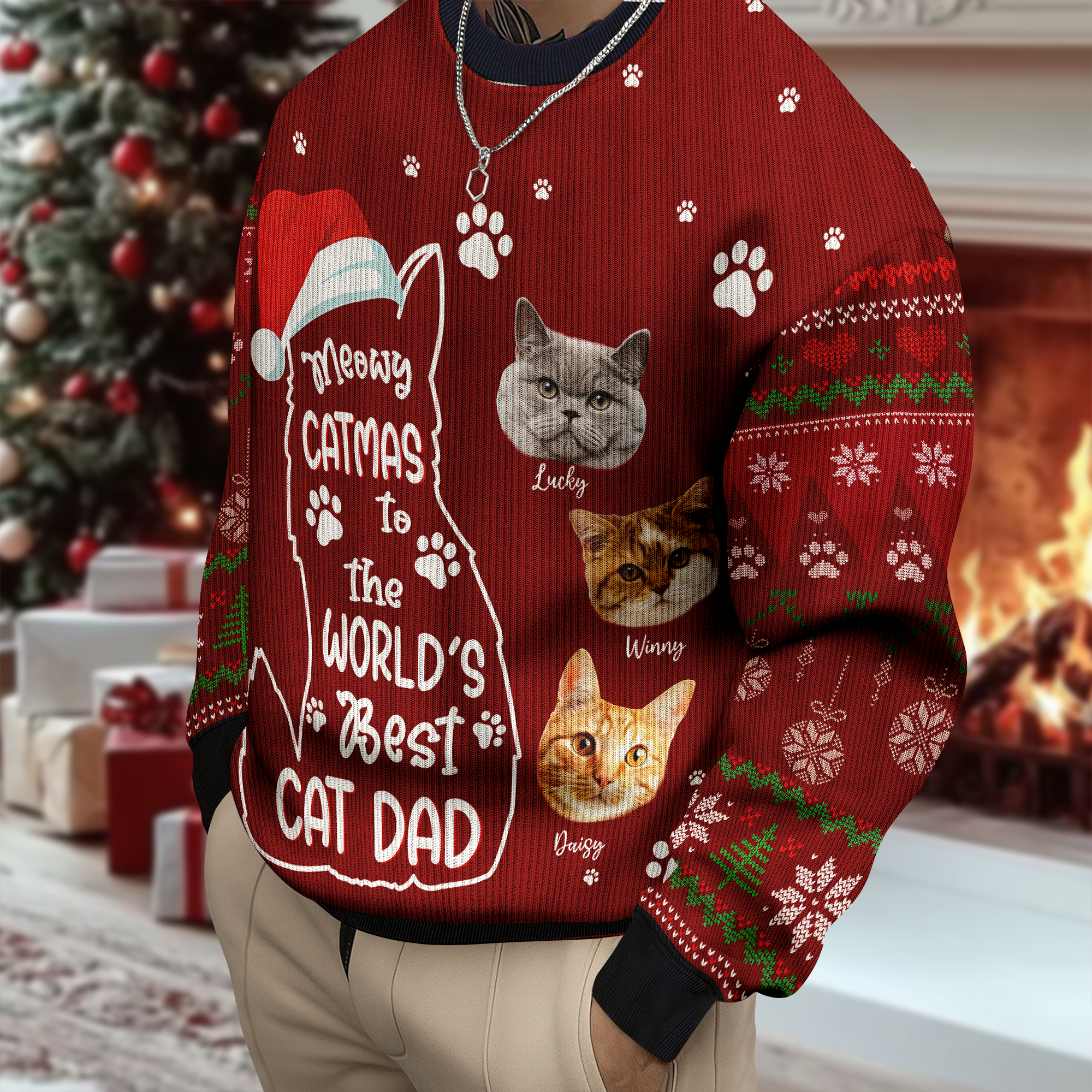 Celebrate the season with the Custom Photo Meowy Catmas To The World Cat Ugly Sweater! This playful and cozy sweater brings holiday cheer with a quirky feline twist, perfect for standing out at any festive gathering. Made for cat lovers who want to spread joy and humor, its unique design makes it a conversation starter and a must-have for your holiday wardrobe. Embrace comfort and fun all winter long with this charming, one-of-a-kind ugly sweater.