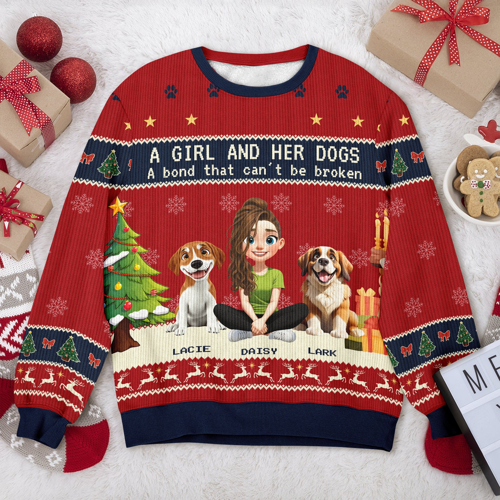 Celebrate the holiday season in heartwarming style with this personalized "A Girl With Her Dogs" ugly Christmas sweater. Perfect for dog lovers, it brings festive cheer and cozy comfort, making every moment with your furry friends even more special. Stand out at holiday gatherings while showcasing your passion for pups with this unique and charming sweater.