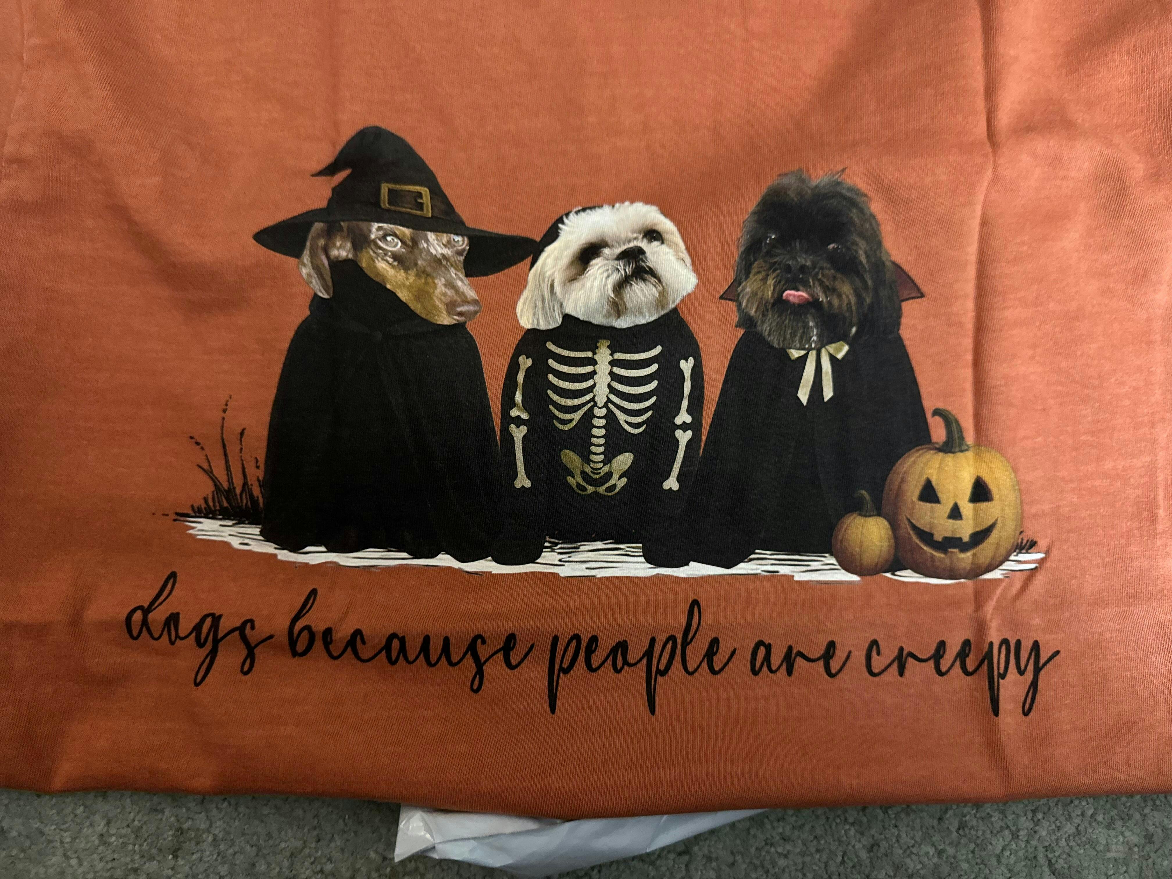 Celebrate Halloween with a touch of humor and comfort in this "Dogs Because People Are Creepy" shirt. Perfect for dog lovers who prefer furry friends over spooky crowds, this shirt combines a witty message with cozy wearability. Whether you're handing out treats or enjoying a low-key night, it’s a fun way to express your love for dogs and keep the Halloween spirit lighthearted.