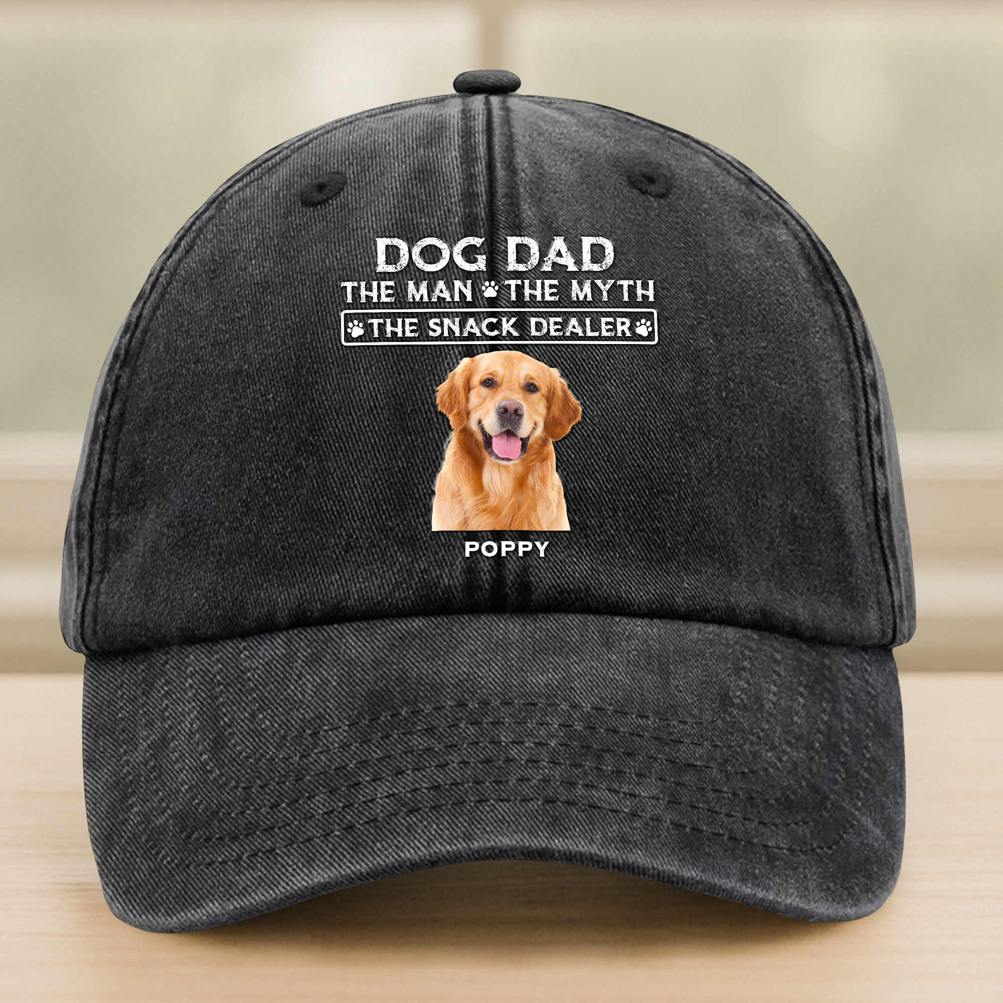 Stand out from the crowd with The Man The Myth The Snack Dealer Washed Denim Baseball Cap! Show off your love for your furry friends with this custom pet photo cap. Perfect for dog dads and cat dads, it also makes a great gift for any pet lover. Express your passion for your pets with this stylish and unique accessory.