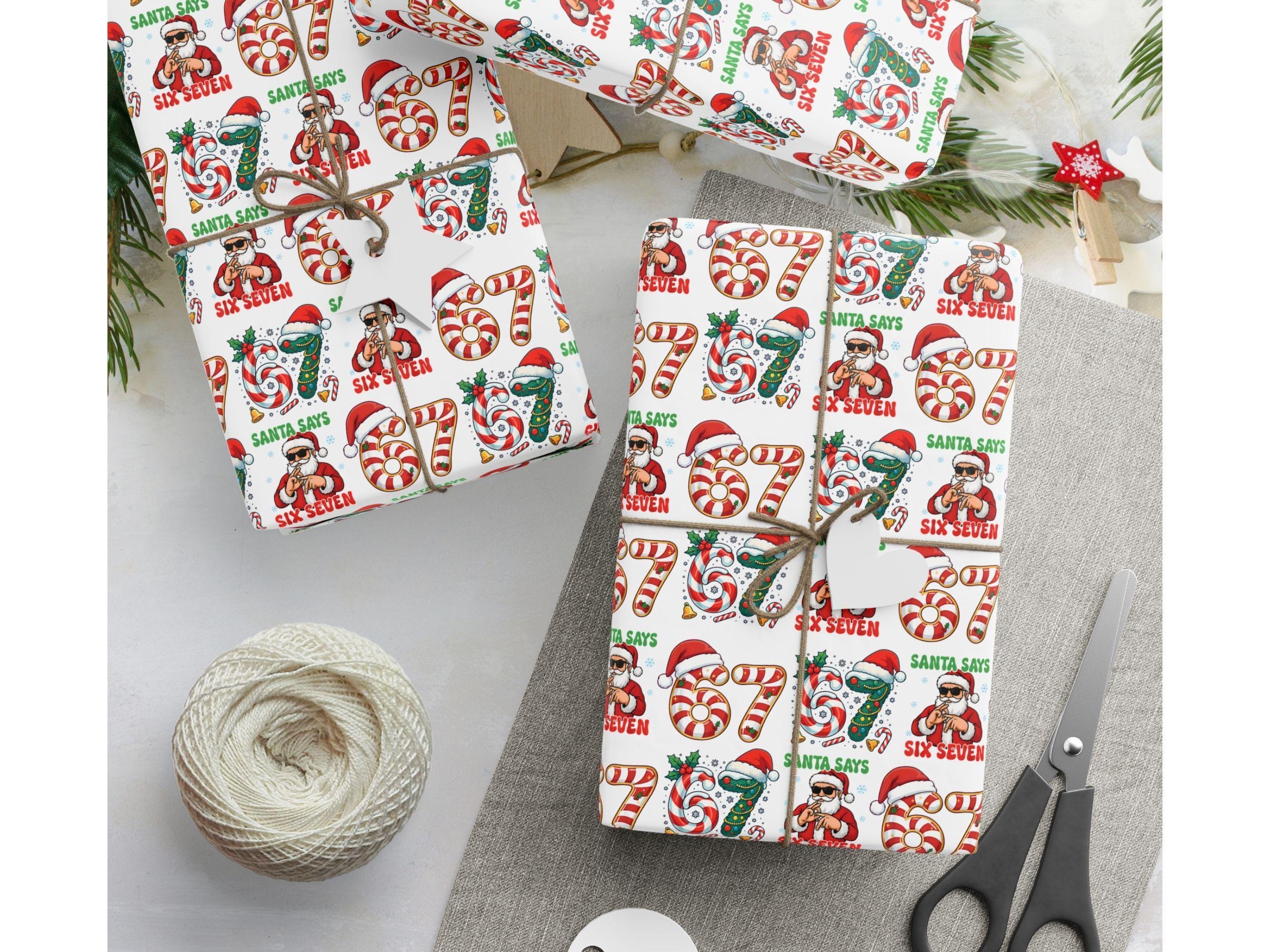 Bring laughter to your holiday celebrations with the Santa Says Six Seven wrapping paper. Featuring the viral "67" meme, this gift wrap adds a fun and memorable touch to your Christmas presents. Perfect for meme lovers and those who appreciate unique holiday humor, it’s an ideal gift idea that will have everyone smiling under the tree. Make your gifts stand out with this playful and trendy wrapping paper.