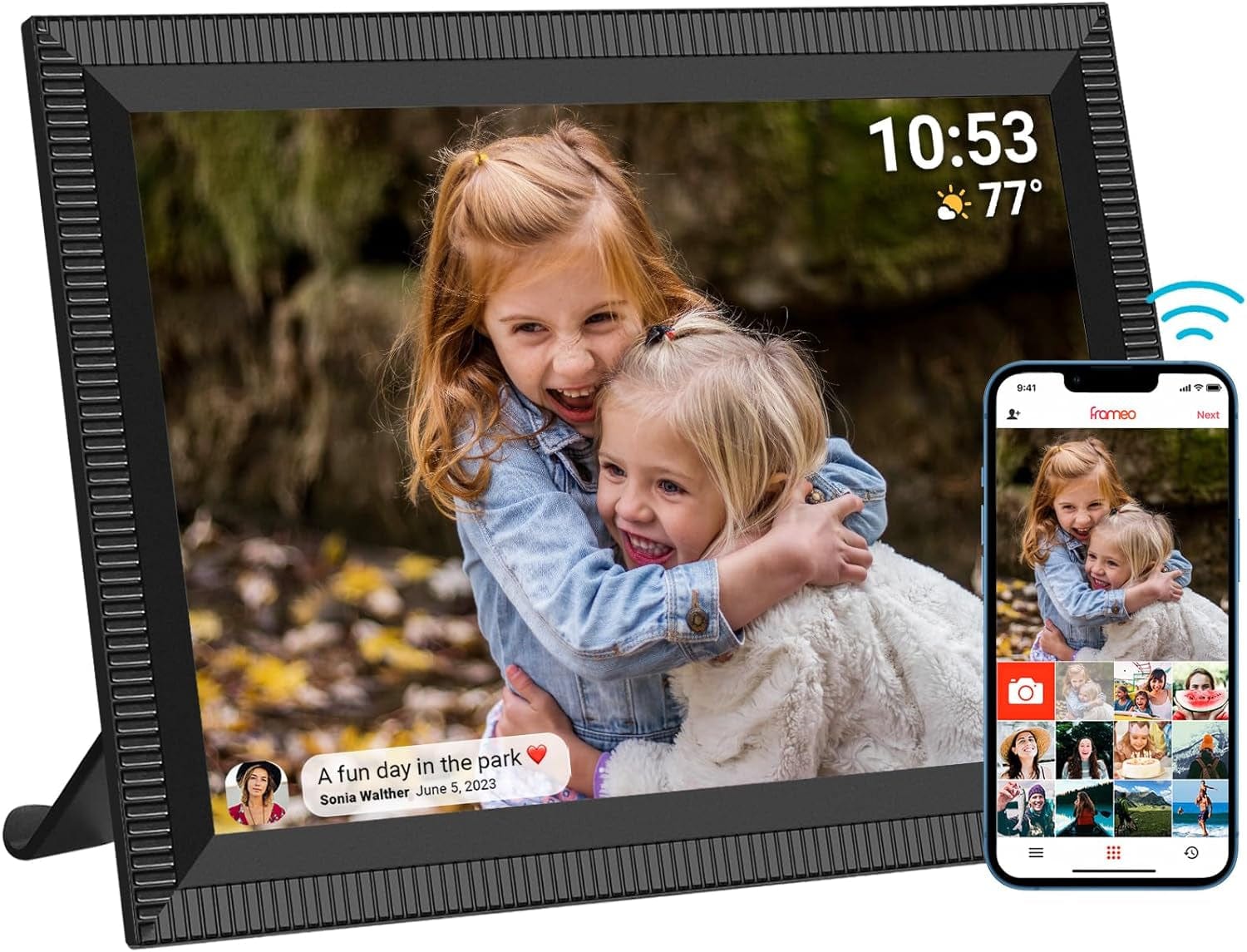 Wi-Fi & App “Frameo”Frameo digital picture frame can receive photos and videos with WiFi (2.4GHZ) connected. And with the free App “Frameo”( it can be downloaded from Google Play and App Store), you can quickly and easily share your wonderful moments with beloved ones |
