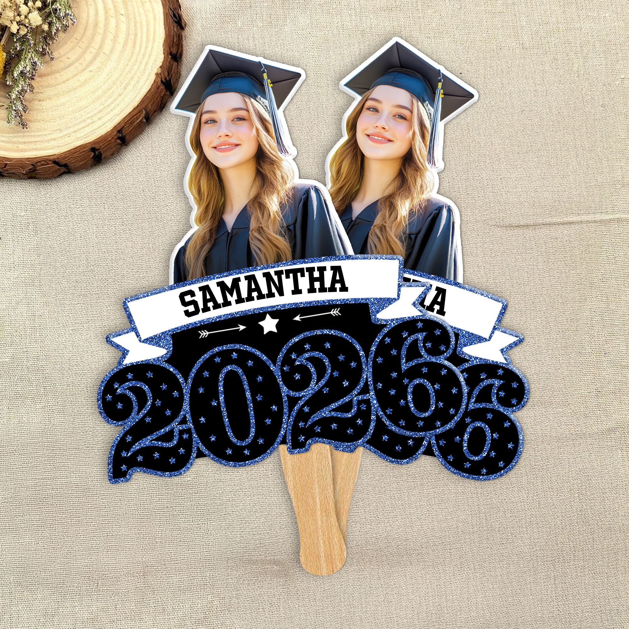Celebrate your graduate in style with this eye-catching personalized face fan! Featuring a custom photo with shimmering faux glitter effects and their name, it's the perfect keepsake that doubles as a practical accessory. Ideal for graduation parties, outdoor celebrations, or as a memorable gift they'll treasure. Watch guests smile when they see your graduate's face on this unique, conversation-starting fan. A fun and functional way to commemorate this milestone moment!